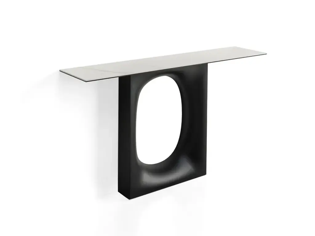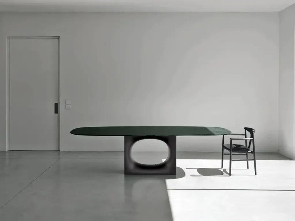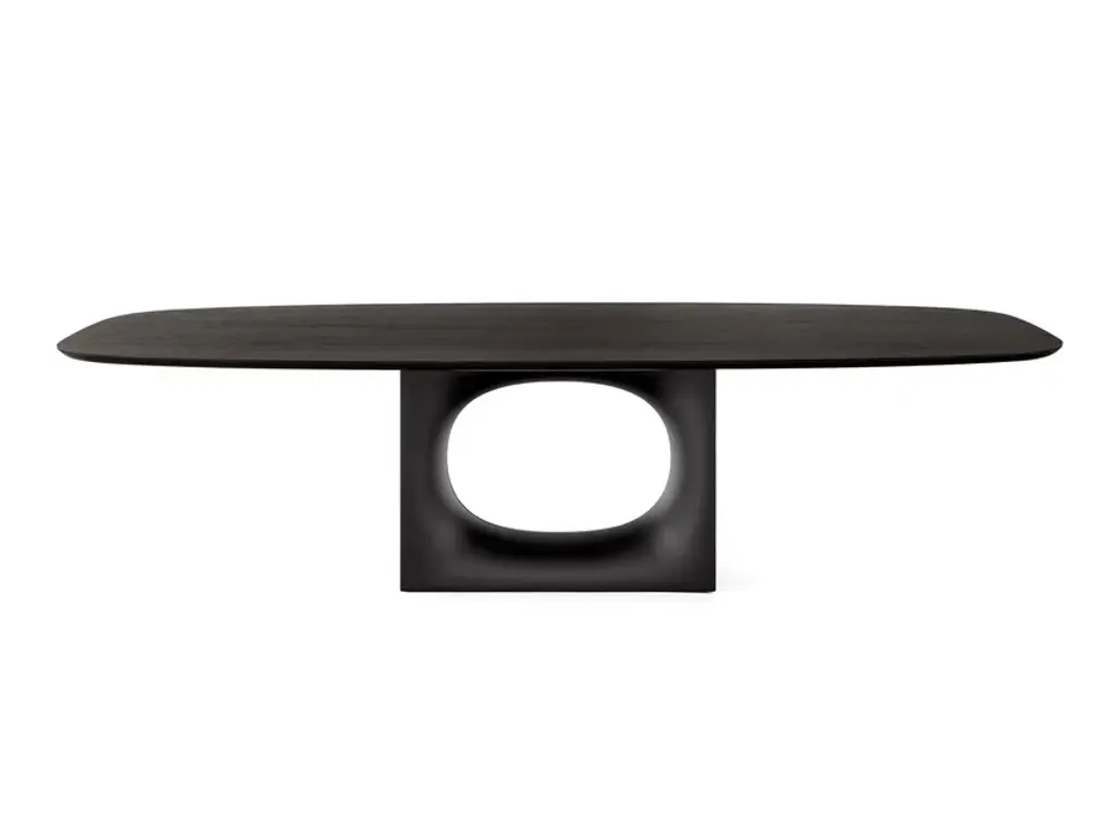 The combination of Kristalia's technology with Kensaku Oshiro's creativity has led to Holo: a table featuring an original base and an oval hole, with a softly moulded shape in sheet metal, made using a process that involves many moulding and bending phases. This original and stable base, available in various finishes, supports a thin laminate or solid wood (thicker) top. Two options are available for this furnishing object with a truly unique personality.Also available with glass top.