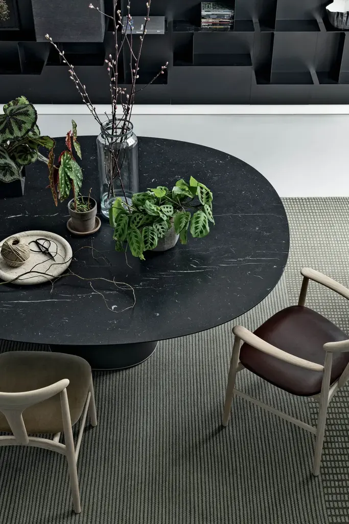 When asked to design a round version of the iconic Holo table, Kensaku Oshiro started again from that hole and the oval shape, its hallmark feature and created a base support for the top. Solid and sculptural, the base support is painted in the new “Exclusive colours” finishes, the result of research by Kristalia’s powder—coating centre. The top with its round or organic shape and tapered edge is now also available in marble. More than a table, Holo Pillar is proof of the material existence of holes.