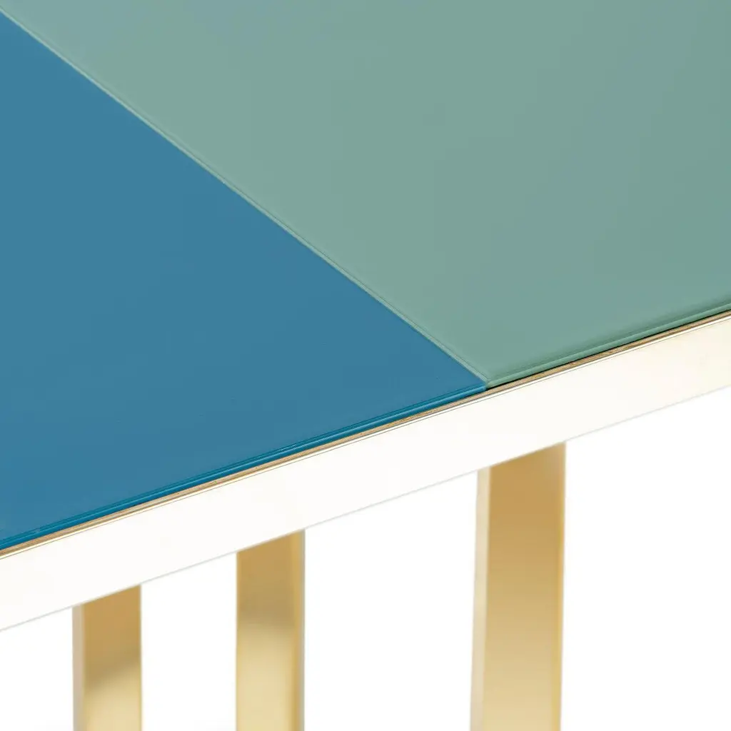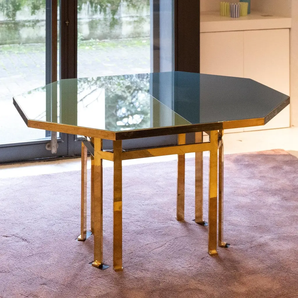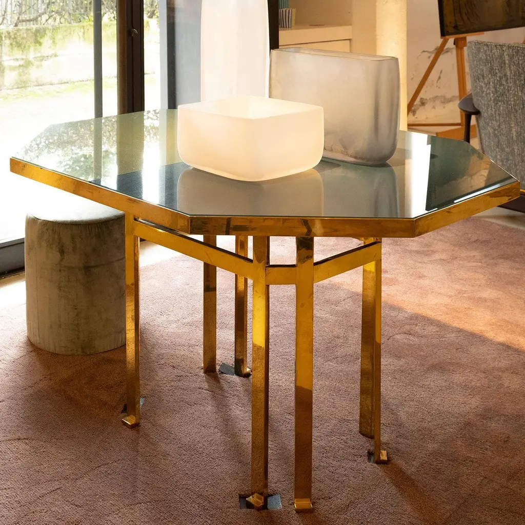 The hexagon, a geometric shape renowned for its harmonious rigor, sets the formal inspiration of this superb table. Ideal to fit in contemporary settings, it flaunts a luminous brass base with right-angled feet that support the stylish top, which is comprised of an underlying board in black-lacquered wood concealed by the two-tone glass layer placed above that is back painted for a stunning chromatic effect.