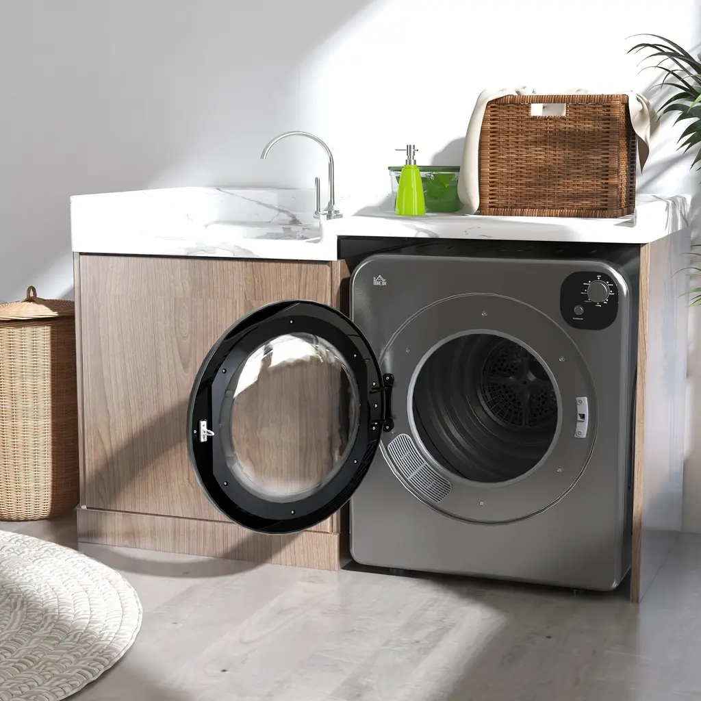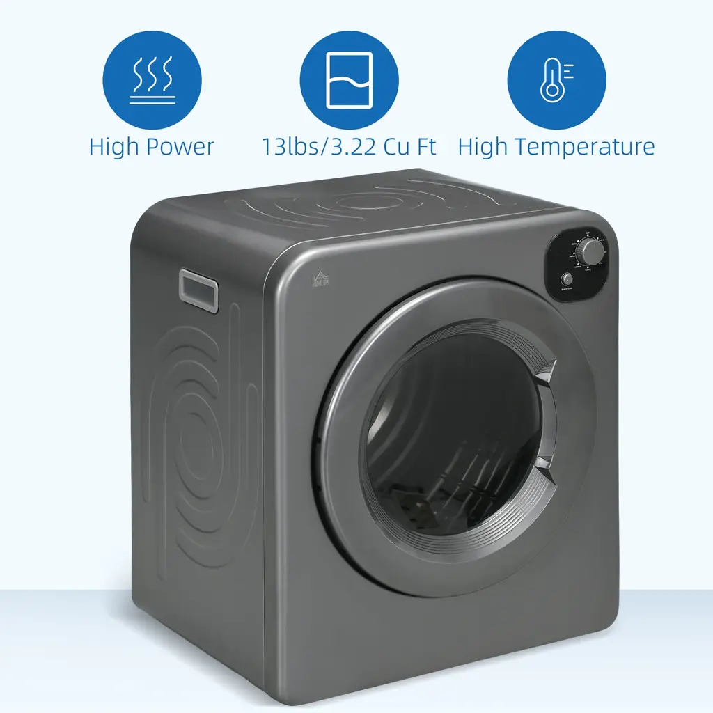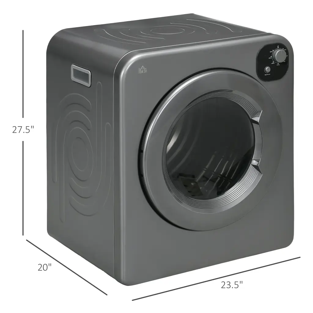 Descriptions:Don't waste time going to the laundry mat to dry your clothes with this HOMOM electric dryer. If you live in a limited space or don't have a lot of extra space for your laundry needs, this dryer can fit into a corner, on a wall, or stack it on top of your washer. If you need to move it, this compact apartment dryer has a carry handle to make it easier to carry around the house. Let HOMCOM save you time to get other tasks done by not going to the laundry mat with the clothes dryer machine.Features:● 7 modes including extra, smart, mix airing, and other three times for selection● 1300 W power and 360° powerful turbine drum● 13 lbs. capacity (wet clothes) can dry 15 T-shirts or 35 kitchen towels● 3 installation modes provide great convenience● Ideal for small spaces such as a laundry room, apartment, or dorm● 2 layer filter prevent lint buildup for sooner and better drying● Stainless drum is rust-resistant and quality for reliable daily use● Air vent connector is included● Assembly requiredSpecification:- Color: Gray- Material: PCM Colored Steel, Stainless Steel, Plastic- Overall Dimensions: 23.5" L x 20" W x 27.5" H- Drum Size: Φ 22.5" x 13" H- Annual Energy Consumption: 231 kWh- Noise: ≤65db- Voltage: 120 V/60 Hz- Power: 1300 W- Cable Length: 58.8"- Certification: ETL/CETL, DOE- Item Label: 853-025V80GYNote The wall-mounted bracket is not included