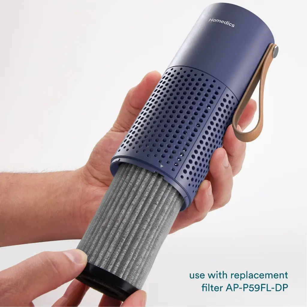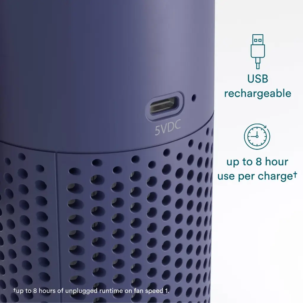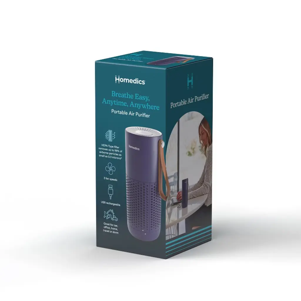Breathe better on the go with the Homedics Portable Air Purifier, featuring 3-in-1 purification that removes up to 99% of airborne particles as small as 0.3 microns. With 3 fan speeds, plus quiet operation, this purifier delivers clean air wherever you go—perfect for home, car, office, or travel. Compact and always ready to go.*Removes up to 99% of airborne particles as small as 0.3 microns from air that passes through the filter media. **Up to 8 hours of unplugged runtime on fan speed 1.