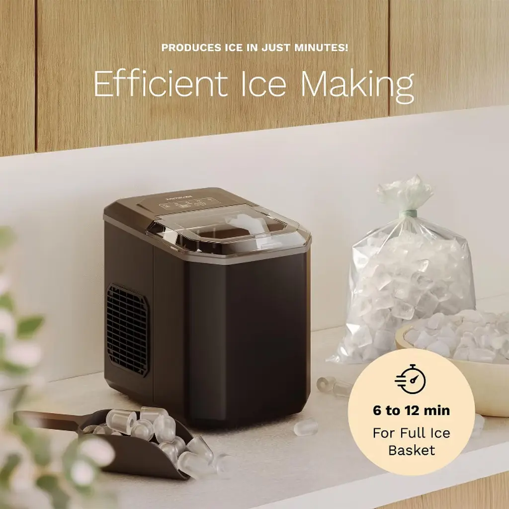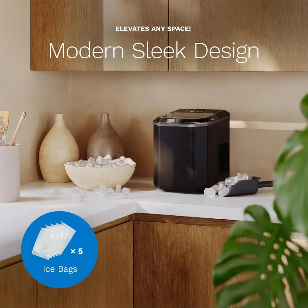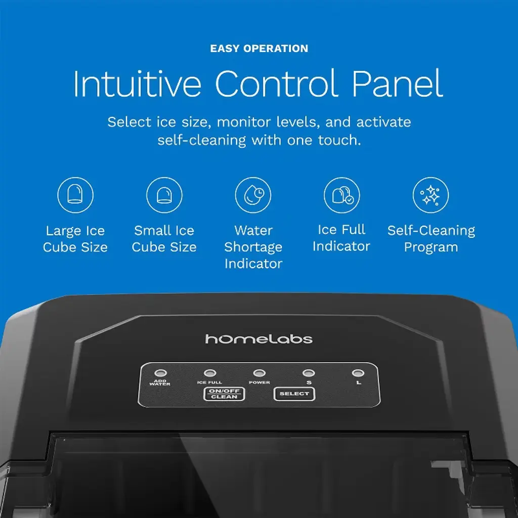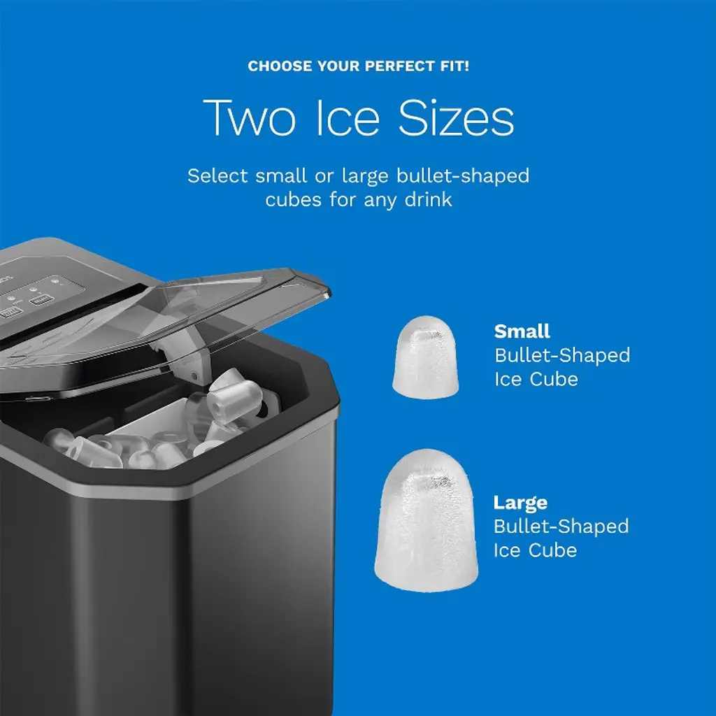 Enjoy ice on demand with the hOmeLabs Countertop Ice Maker – a sleek, compact machine designed to deliver convenience and style to your kitchen or bar. Whether you're hosting guests or just want to chill your favorite drinks, this ice maker produces up to 26 pounds of bullet-shaped ice per day, with the first batch ready in just 6–12 minutes. Customize your ice with two size options, and store it easily using the included ice scoop and 5 bonus ice bags – perfect for on-the-go or freezer storage. The intuitive control panel makes operation simple, and the self-cleaning mode ensures your machine stays fresh and ready for use. Compact enough for countertops and powerful enough to keep up with your needs, this stylish black ice maker is the perfect addition to any home, kitchen, RV, or bar setup.