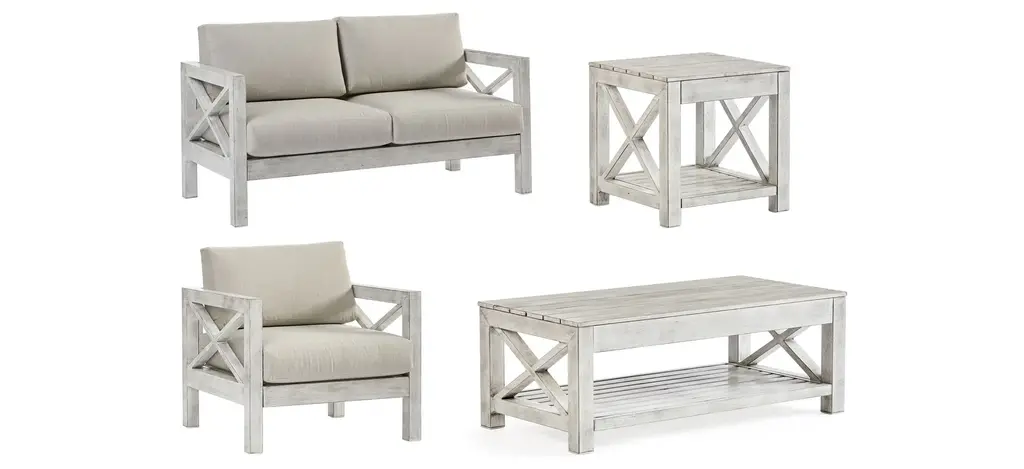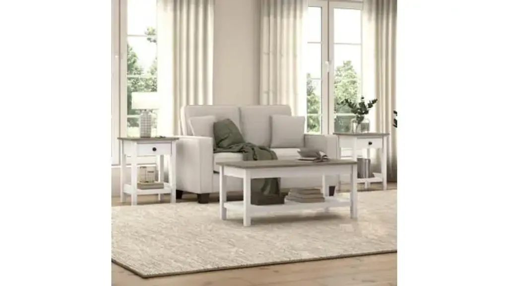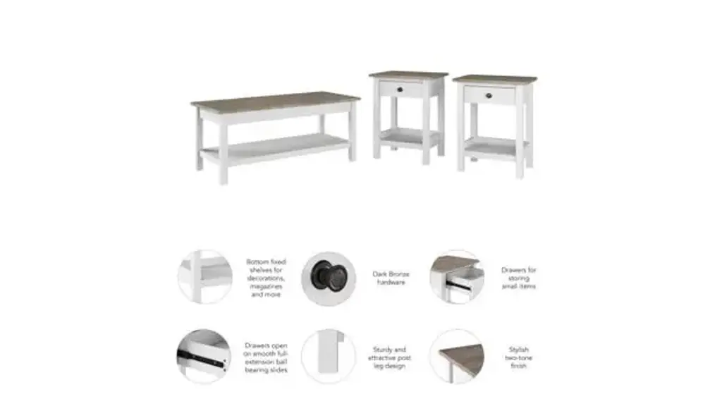 The Bush Furniture Mayfield Coffee Table with End Tables is a great way to organize any room or living space while invoking the cozy, welcoming charm of modern farmhouse styling. The living room set is a versatile ensamble that enhances any room or living space with its open-concept design, perfectly supporting all living room essentials while adding a touch of rustic charm. Coffee table's sturdy top surface supports up to 50 lbs., while the bottom fixed shelf is perfect for decorations, magazines, and more. Each end table's sturdy top surface supports up to 50 lbs., while the sides of the bottom fixed shelf offer additional security to keep small items and decorations in place. The end tables are designed for maximum stability and include anti-tip hardware to anchor them to a wall. End tables feature a small drawer that opens on smooth ball-bearing slides and is perfect to store writing materials, TV remotes, and other small items. The coffee table and the end tables are finished on all sides, allowing for placement anywhere in the room. Modern farmhouse living room set features a stylish two-tone finish with Dark Bronze Hardware, while the sturdy and attractive post leg design withstands years of use in virtually any residential setting. This set was tested to meet ANSI/BIFMA X6.5 quality standards for safety and performance, ensuring reliability and dependable functionality in residential and home office settings. Coffee Table Dimensions: 41.97" W x 20" D x 17.99" H. Each End Table Dimensions: 18.82" W x 15.51" D x 24.41" H. Ships ready for easy assembly.
