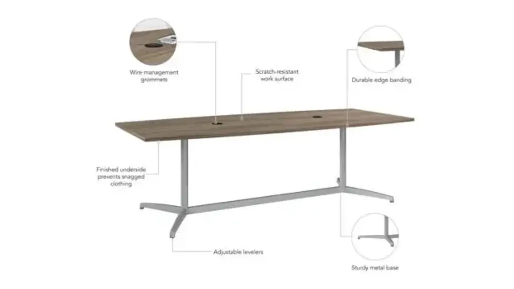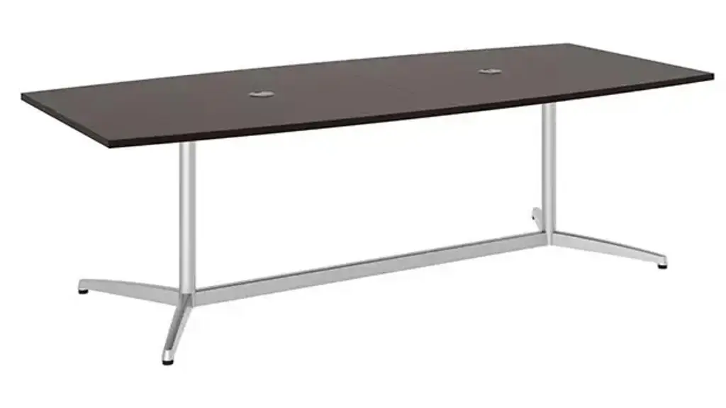 Bring your team together in a private or open plan office with the Bush Business Furniture 96" W x 42" D Boat Shaped Conference Table. Perfect for medium to large-sized groups, this meeting table provides ample room for 6-8 users to collaborate with laptops, paperwork and other materials. A durable thermally fused laminate work surface with continuous edge banding protects against scratches, stains, nicks and dings throughout years of daily meetings while a finished underside helps prevent snagged clothing. The tabletop also includes two wire management grommets to accommodate cords and cables from a projector or speaker phone. The large conference room table is supported by a sturdy metal base for a weight capacity of 200 lbs, making it great for use in a training area or education space in addition to the boardroom. Choose from a variety of contemporary and traditional finish options for a look that suits any environment. This long office table is tested to meet ANSI/BIFMA quality standards for safety and performance. Bush Business Furniture Conference Tables are available in a variety of styles and sizes to complement any professional environment. North American made with globally sourced materials. Overall Dimensions: 95.2"W x 42.01"D x 28.65"H. Ships ready for easy assembly.