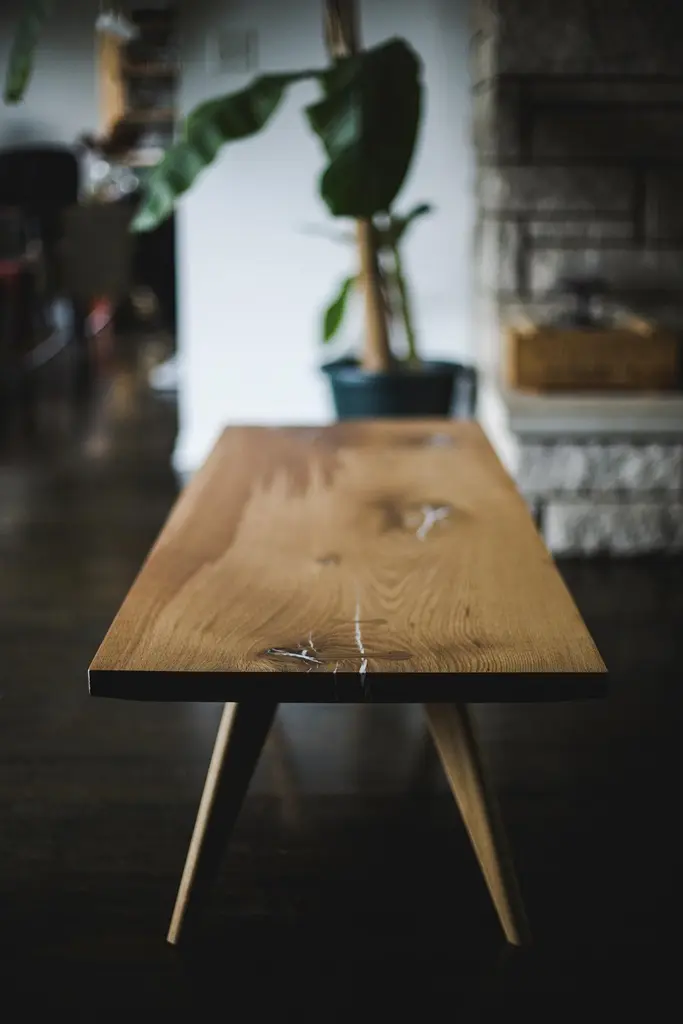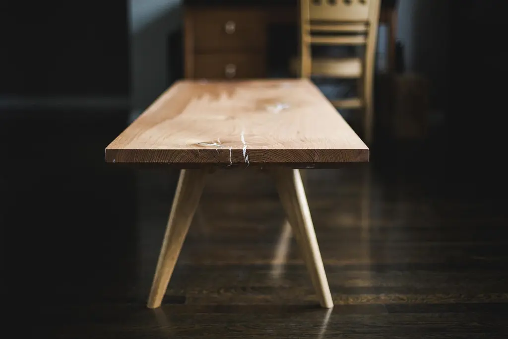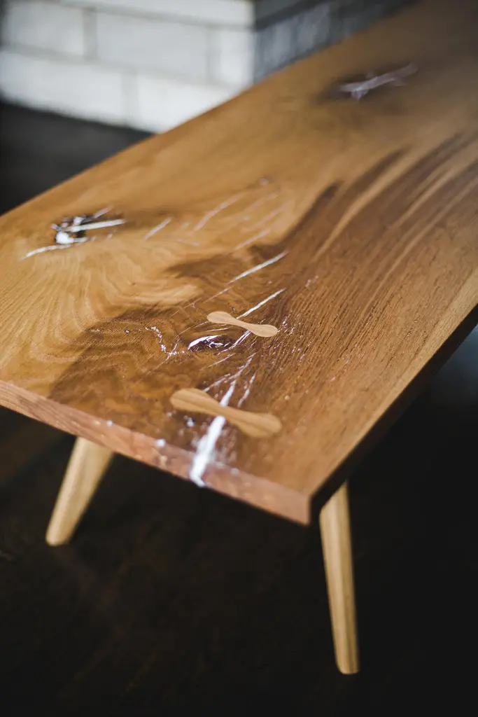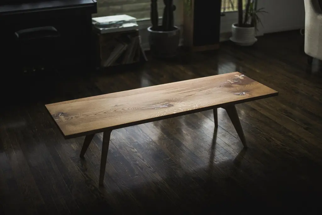 A modern coffee table / bench made form single slab or multiple dimensional boards. Checks and knots filled with an opaque white epoxy resin and reinforced with white oak key inlays.All wood construction and joinery.60" long x 20" deep x 16" tall (can be made custom)MATERIALS & CONSTRUCTIONShown in White Oak (can be made from any available wood)VOC-free all-natural oil finishEpoxy resin