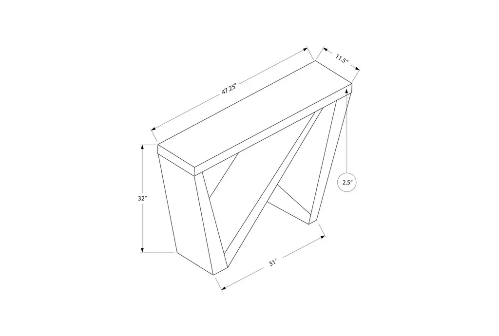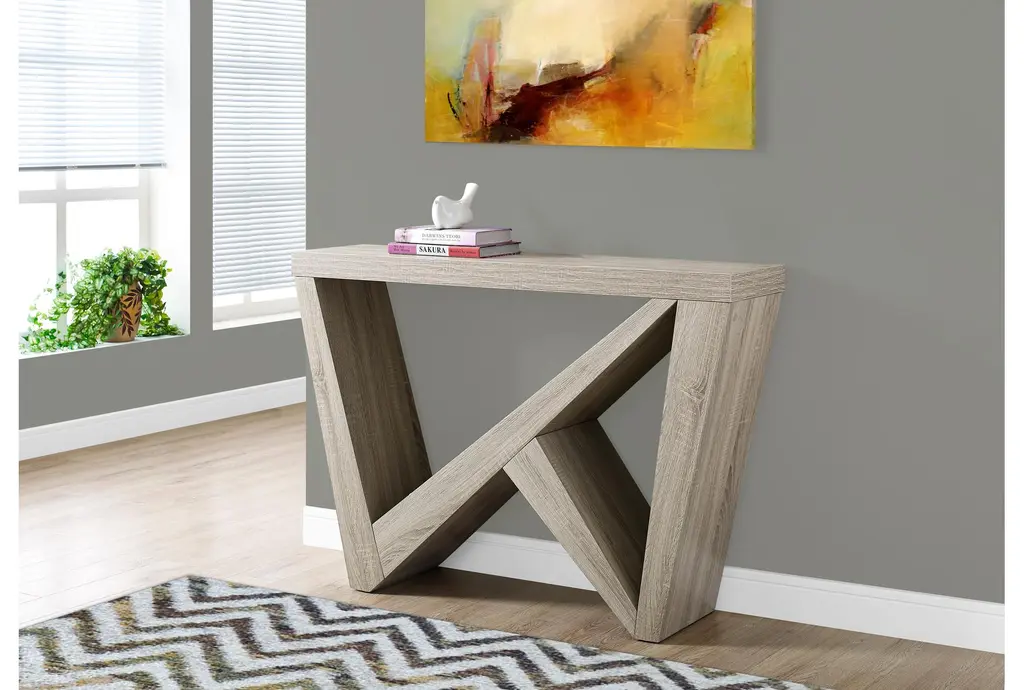 The Hugo Modern Brown 47" Console Table is a stylish and functional addition to any modern or contemporary space. Crafted from high-quality rubberwood with a dark taupe wood-look finish, this console table features an eye-catching asymmetrical design with intersecting panels that create open spaces. Its extra-thick panel construction ensures durability, making it perfect for entryways, hallways, or living rooms with limited space.