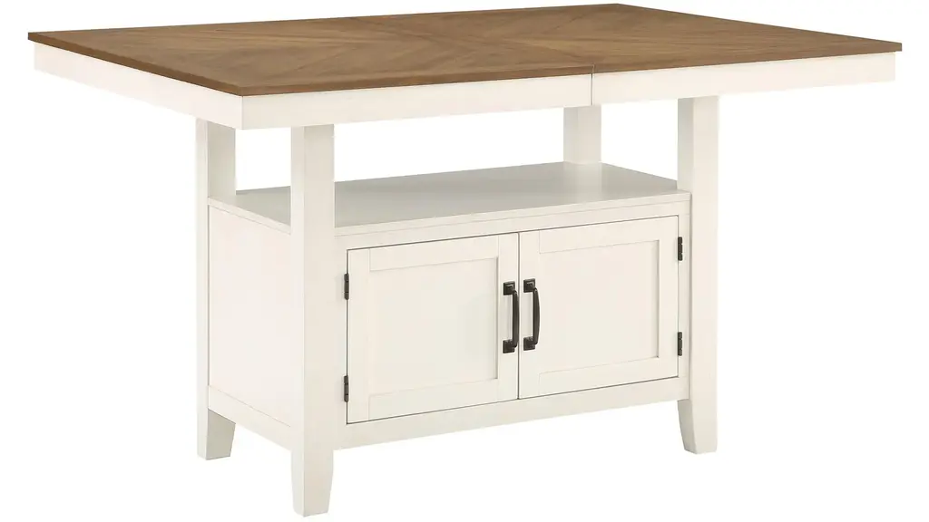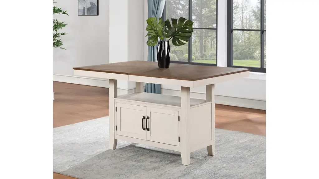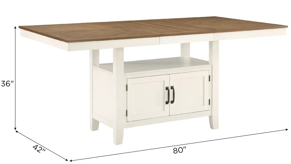 Hyland Counter Table in a fashion-forward milk and honey two-tone finish. Oil-rubbed nickel hardware completes the neutral transitional look that features relaxed styling that can be dressed up or down. The Counter Table features two doors in the base for hidden storage and a shelf for storage or display. The 20-inch leaf extends the table to a full 80-inches for seating up to eight. Great for farmhouse, modern or coastal interiors.