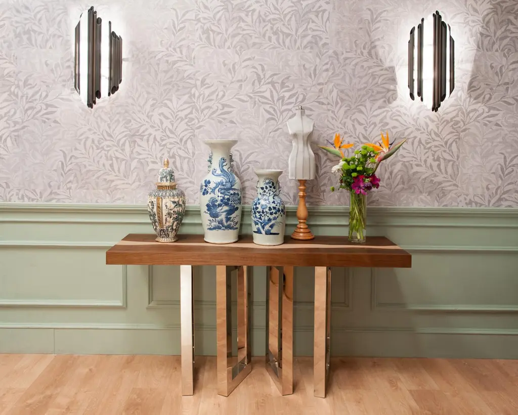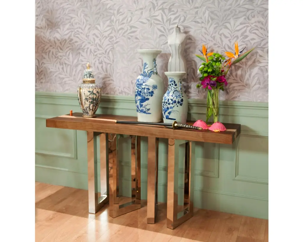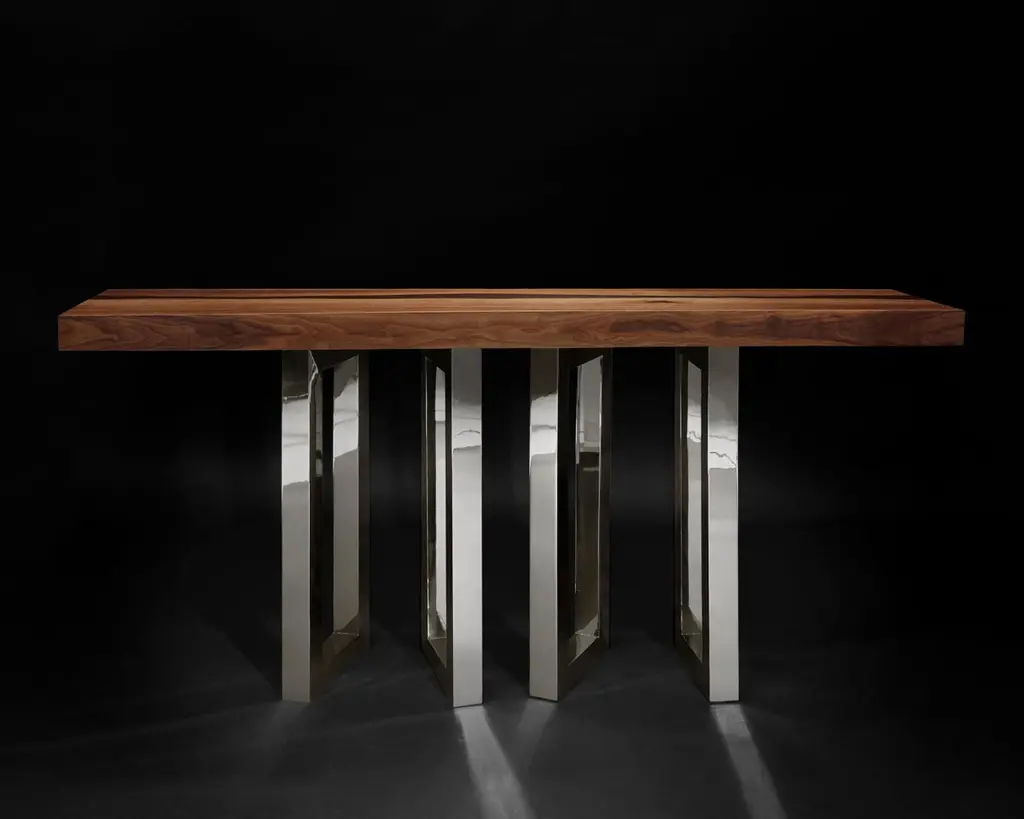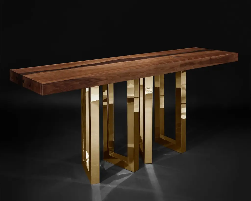 A solid block of walnut held up by what seems to be a casually arranged group of glittering legs. A composite of contrasting elements, massive and sophisticated, strong and passionate; Il Pezzo 6 Console is a harmonious and timeless whole.The tabletop is made of 7 cm thick solid walnut and it’s gently crossed by a vein which reminds a majestic river, made of solid ash or wenge stained solid wood. The choice of the wood grain alignment is done with great care to create flowing veins and colors.The treatment on the wood is done with natural oil that protects the wood but at the same time allows it breathe, leaving the extraordinary feel of this beautiful, natural material unchanged to the touch. Furthermore the final coat on the top is done with Nanotechnology, an organic silica- based natural treatment which makes the wood water repellent. The legs are mad of hand- welded brass, available in different finishes.Each console shows the “Missing Piece” (“Pezzo Mancante” in Italian): a small brass cylinder containing a unique serial number, guarantees its authenticity and individuality.Custom sizes and finishes are also available to suit every preference.All our masterpieces are meticulously crafted in our Atelier located in Florence, Italy, from a small team of people driven by a shared passion for quality and beauty. We constantly strive to create unparalleled works of art, where each piece is a testament to our commitment to craftsmanship and innovation.Top: solid walnut and wenge stained solid woodBase: gold finish brassSize: 200 x 50 x H 81 cm - 78.7" x 19.6" x H 31.9"(also available in size 160 x 45 x H 81 cm, 63" x 17.7" x H 31.9")