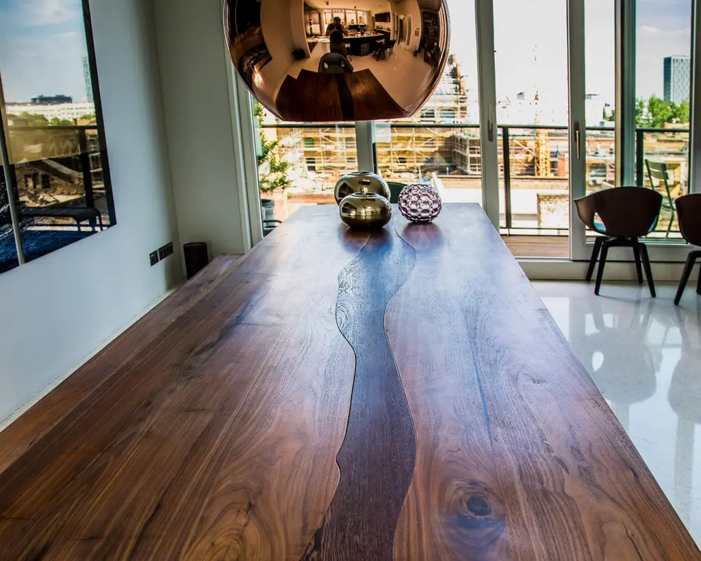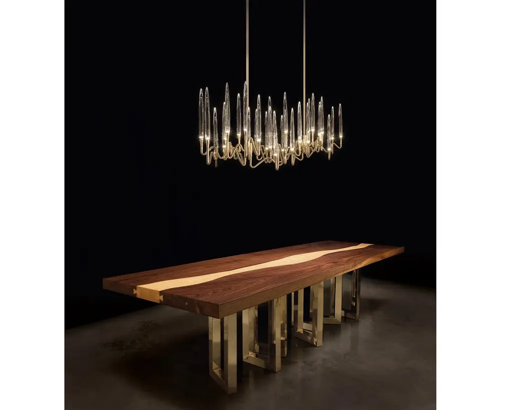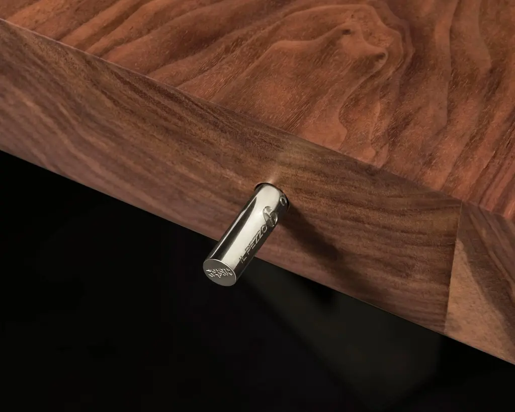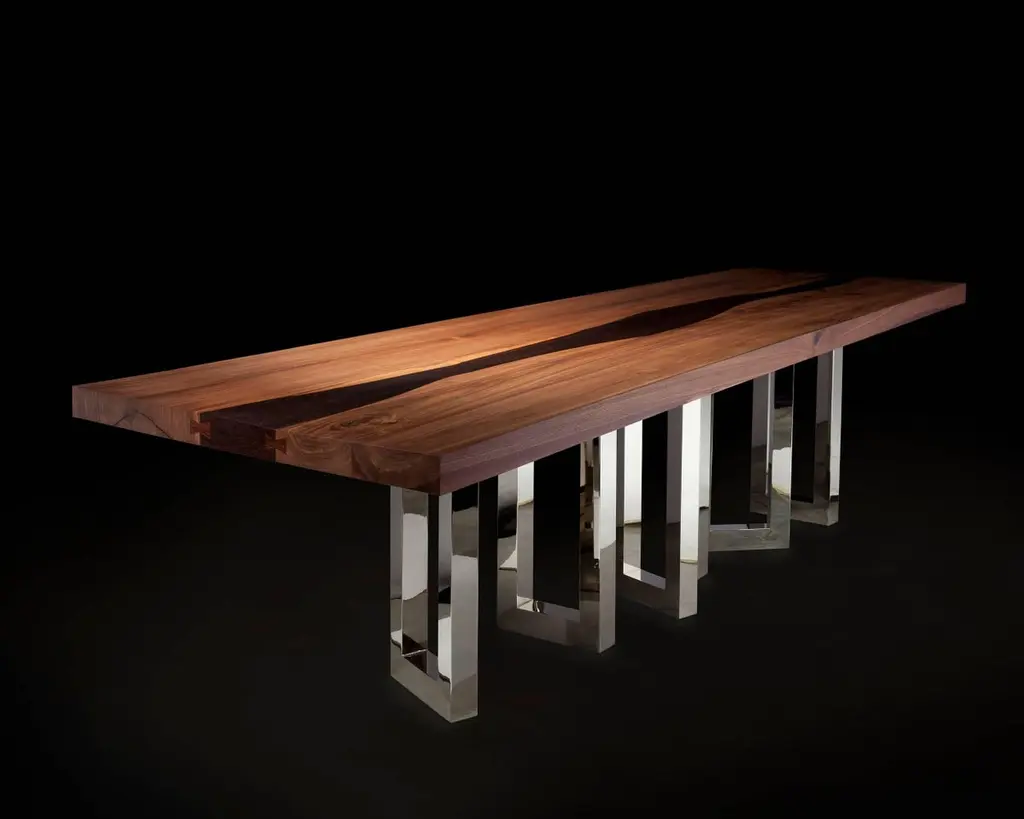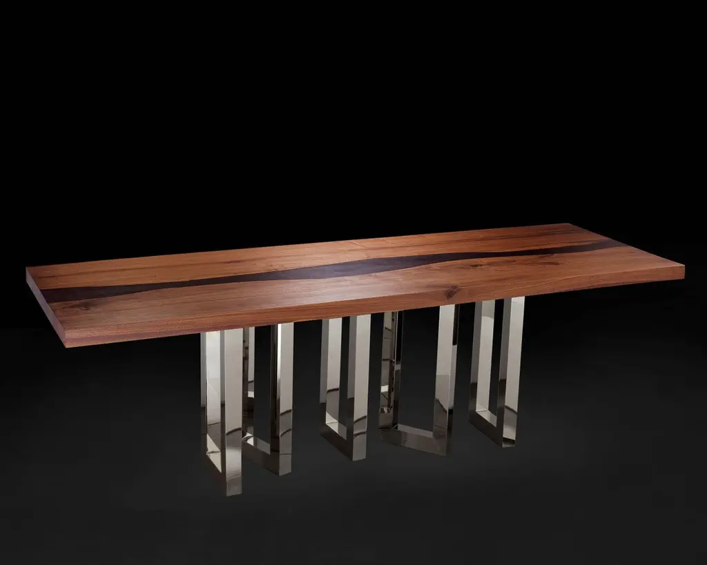 A solid block of walnut held up by what seems to be a casually arranged group of glittering legs. A composite of contrasting elements, massive and sophisticated, strong and passionate; Il Pezzo 6 Table is a harmonious and timeless whole.The tabletop is made of 7 cm thick solid walnut and it’s gently crossed by a vein which reminds a majestic river, made of solid ash or wenge stained solid wood. The choice of the wood grain alignment is done with great care to create flowing veins and colors.The treatment on the wood is done with natural oil that protects the wood but at the same time allows it breathe, leaving the extraordinary feel of this beautiful, natural material unchanged to the touch. Furthermore the final coat on the top is done with Nanotechnology, an organic silica- based natural treatment which makes the wood water repellent. The legs are mad of hand- welded brass, available in different finishes.Each table shows the “Missing Piece” (“Pezzo Mancante” in Italian): a small brass cylinder containing a unique serial number, guarantees its authenticity and individuality.Custom sizes and finishes are also available to suit every preference.All our masterpieces are meticulously crafted in our Atelier located in Florence, Italy, from a small team of people driven by a shared passion for quality and beauty. We constantly strive to create unparalleled works of art, where each piece is a testament to our commitment to craftsmanship and innovation.Top: solid walnut and wenge stained solid woodBase: nickel finish brassSize: 260 x 100 x H 75 cm, 102.4" x 39.4" x H 29.5"