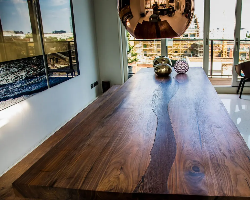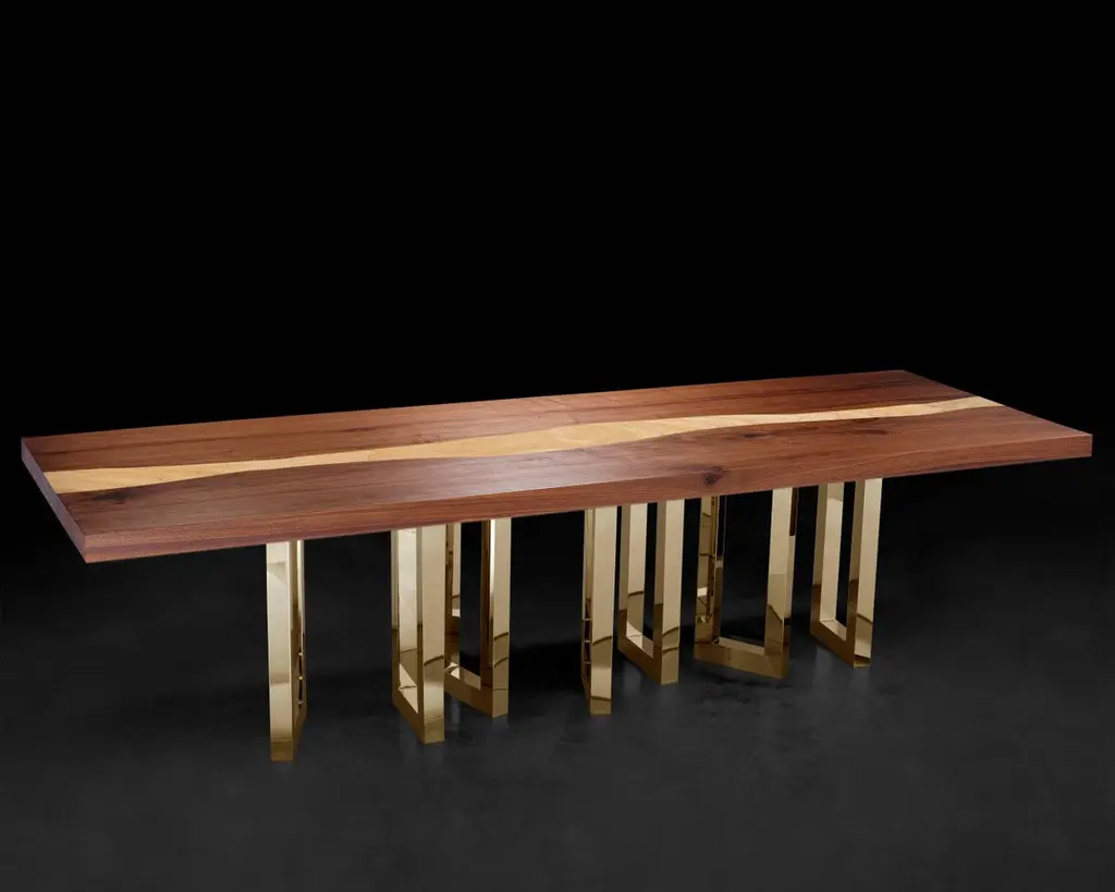 A solid block of walnut held up by what seems to be a casually arranged group of glittering legs. A composite of contrasting elements, massive and sophisticated, strong and passionate; Il Pezzo 6 Table is a harmonious and timeless whole.The tabletop is made of 7 cm thick solid walnut and it’s gently crossed by a vein which reminds a majestic river, made of solid ash or wenge stained solid wood. The choice of the wood grain alignment is done with great care to create flowing veins and colors.The treatment on the wood is done with natural oil that protects the wood but at the same time allows it breathe, leaving the extraordinary feel of this beautiful, natural material unchanged to the touch. Furthermore the final coat on the top is done with Nanotechnology, an organic silica- based natural treatment which makes the wood water repellent. The legs are mad of hand- welded brass, available in different finishes.Each table shows the “Missing Piece” (“Pezzo Mancante” in Italian): a small brass cylinder containing a unique serial number, guarantees its authenticity and individuality.Custom sizes and finishes are also available to suit every preference.All our masterpieces are meticulously crafted in our Atelier located in Florence, Italy, from a small team of people driven by a shared passion for quality and beauty. We constantly strive to create unparalleled works of art, where each piece is a testament to our commitment to craftsmanship and innovation.Top: solid walnut and solid ashBase: gold finish brassSize: 300x100xH75 cm - 118"x39.4"xH29.5"