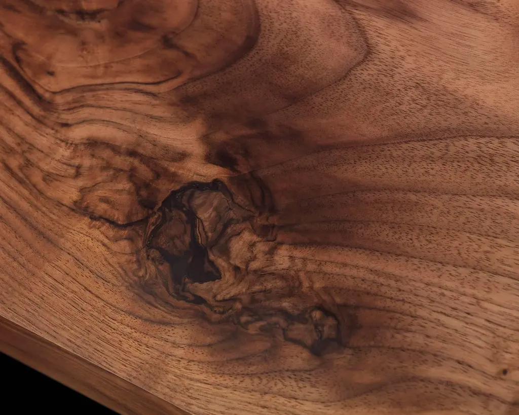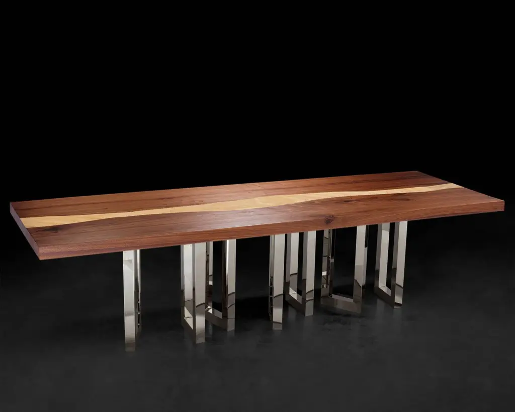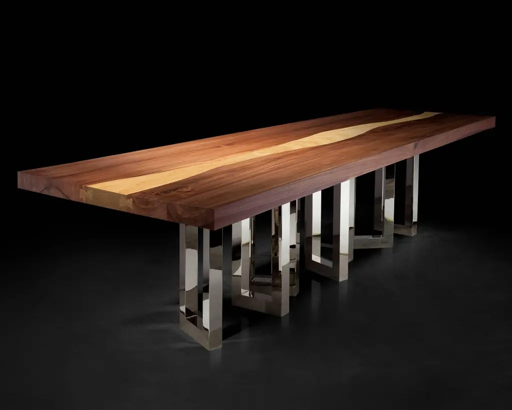 A solid block of walnut held up by what seems to be a casually arranged group of glittering legs. A composite of contrasting elements, massive and sophisticated, strong and passionate; Il Pezzo 6 Table is a harmonious and timeless whole.The tabletop is made of 7 cm thick solid walnut and it’s gently crossed by a vein which reminds a majestic river, made of solid ash or wenge stained solid wood. The choice of the wood grain alignment is done with great care to create flowing veins and colors.The treatment on the wood is done with natural oil that protects the wood but at the same time allows it breathe, leaving the extraordinary feel of this beautiful, natural material unchanged to the touch. Furthermore the final coat on the top is done with Nanotechnology, an organic silica- based natural treatment which makes the wood water repellent. The legs are mad of hand- welded brass, available in different finishes.Each table shows the “Missing Piece” (“Pezzo Mancante” in Italian): a small brass cylinder containing a unique serial number, guarantees its authenticity and individuality.Custom sizes and finishes are also available to suit every preference.All our masterpieces are meticulously crafted in our Atelier located in Florence, Italy, from a small team of people driven by a shared passion for quality and beauty. We constantly strive to create unparalleled works of art, where each piece is a testament to our commitment to craftsmanship and innovation.Top: solid walnut and solid ashBase: nickel finish brassSize: 300 x 100 x H 75 cm, 118" x 39.4" x H 29.5".