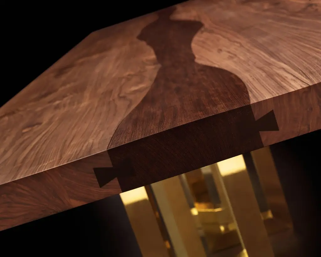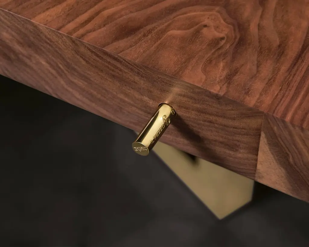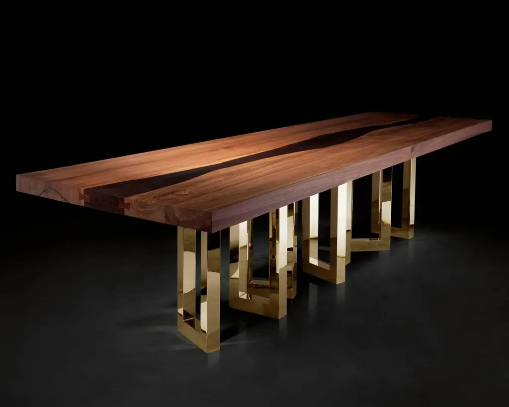 A solid block of walnut held up by what seems to be a casually arranged group of glittering legs. A composite of contrasting elements, massive and sophisticated, strong and passionate; Il Pezzo 6 Table is a harmonious and timeless whole.The tabletop is made of 7 cm thick solid walnut and it’s gently crossed by a vein which reminds a majestic river, made of solid ash or wenge stained solid wood. The choice of the wood grain alignment is done with great care to create flowing veins and colors.The treatment on the wood is done with natural oil that protects the wood but at the same time allows it breathe, leaving the extraordinary feel of this beautiful, natural material unchanged to the touch. Furthermore the final coat on the top is done with Nanotechnology, an organic silica- based natural treatment which makes the wood water repellent. The legs are mad of hand- welded brass, available in different finishes.Each table shows the “Missing Piece” (“Pezzo Mancante” in Italian): a small brass cylinder containing a unique serial number, guarantees its authenticity and individuality.Custom sizes and finishes are also available to suit every preference.All our masterpieces are meticulously crafted in our Atelier located in Florence, Italy, from a small team of people driven by a shared passion for quality and beauty. We constantly strive to create unparalleled works of art, where each piece is a testament to our commitment to craftsmanship and innovation.Top: solid walnut and solid wenge stained oakBase: gold finish brassSize: 300x100xH75 cm - 118"x39.4"xH29.5".