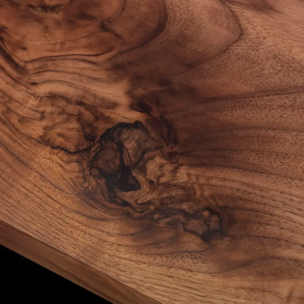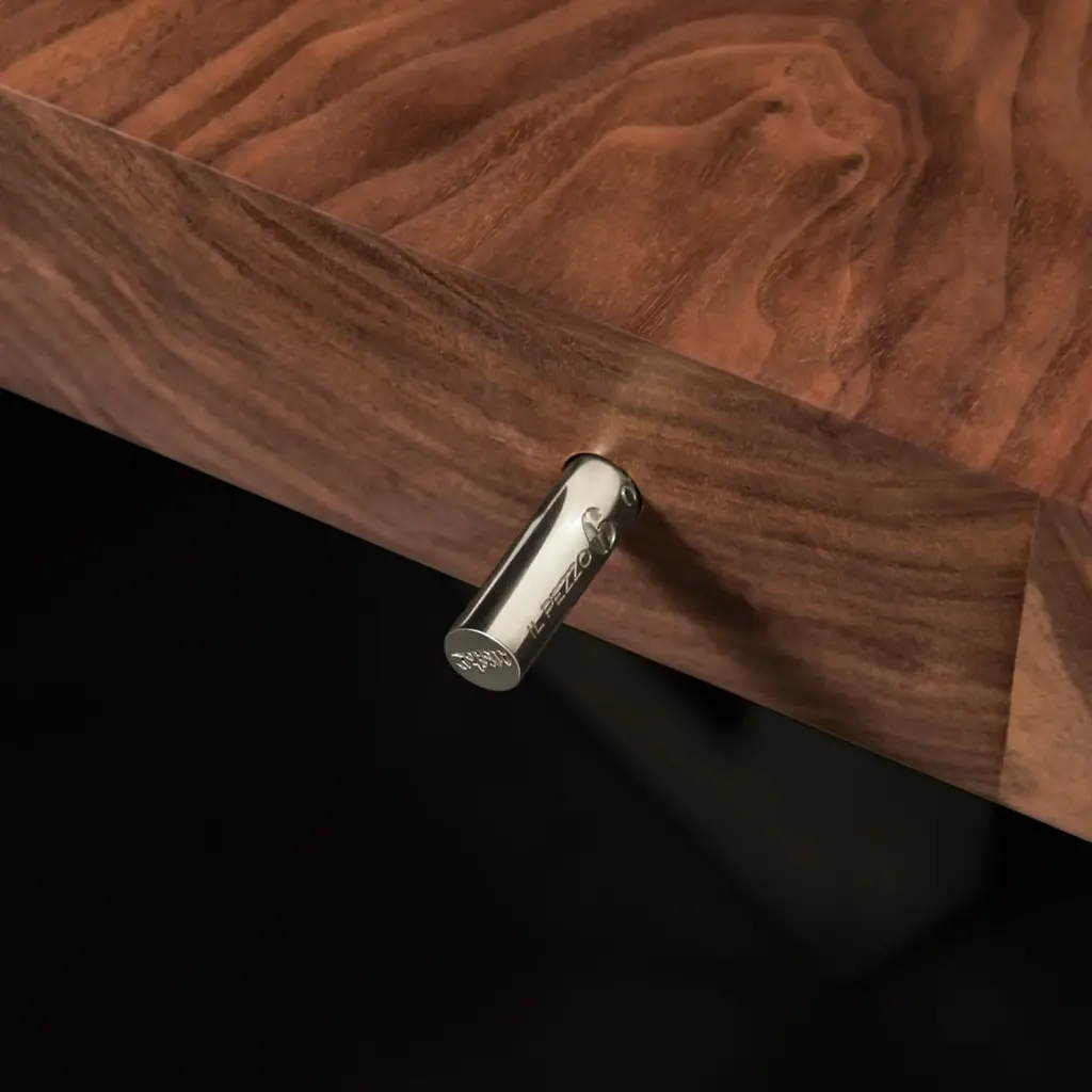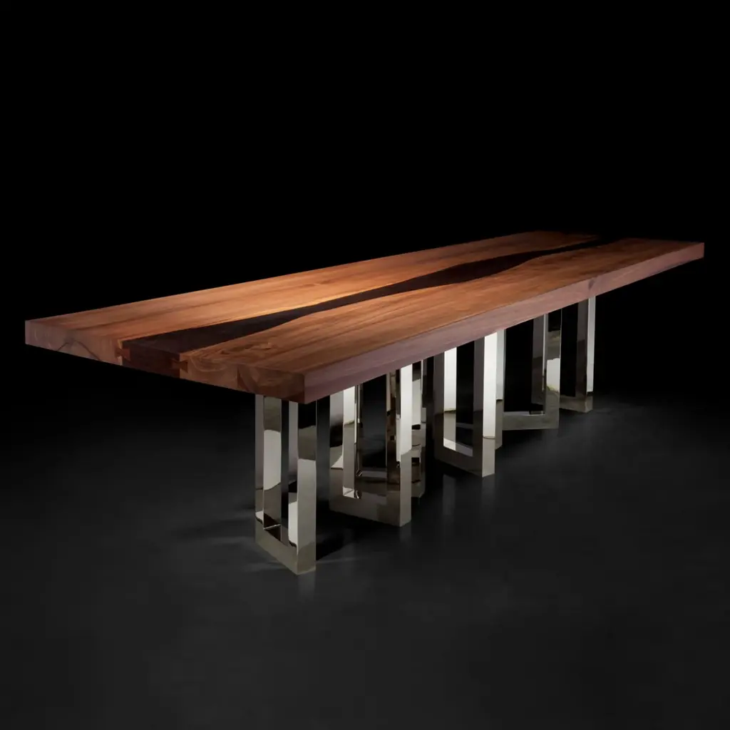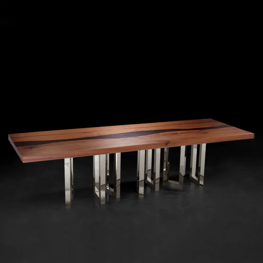 A solid block of fine walnut rests harmoniously on a series of hand-crafted brass legs, while a wood streak in a contrasting color runs across its surface. Il Pezzo 6 Long Table is finished with natural oil that protects the wood while letting it breathe.In each piece, a small brass cylinder with a personalized number attests to its uniqueness and authenticity.This piece can be custom made to your desired size and finish.