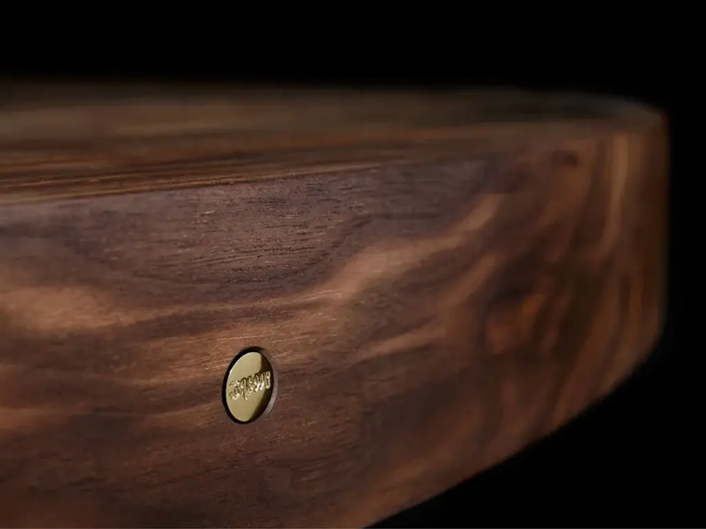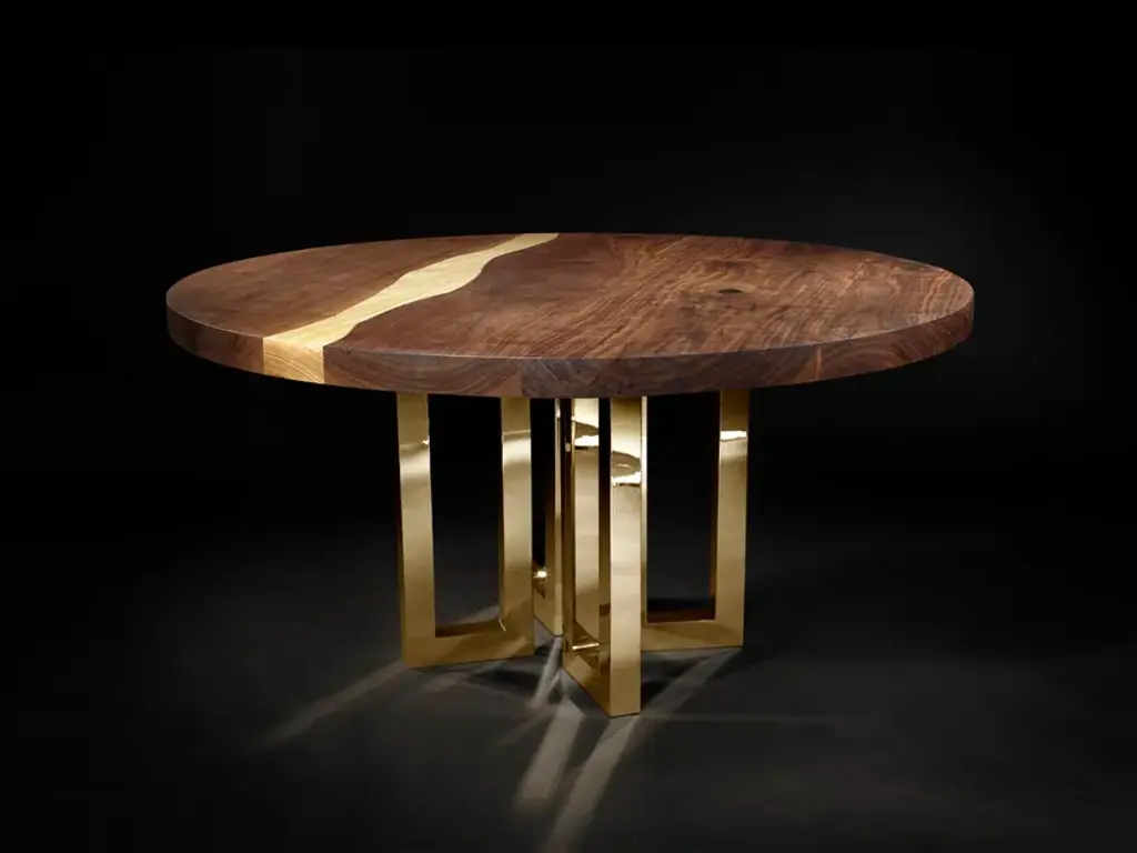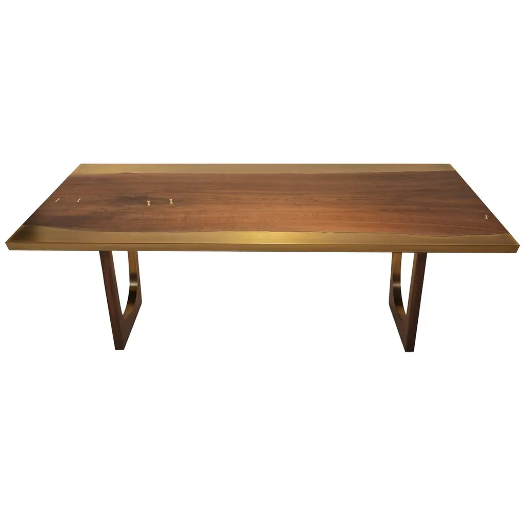 A solid block of walnut held up by what seems to be a casually arranged group of glittering legs. A composite of contrasting elements, massive and sophisticated, strong and passionate; Il Pezzo 6 is a harmonious and timeless whole. The tabletop is made of 7 cm thick solid walnut. The choice of the wood grain alignment is done with great care to create flowing veins and colors. The top is gently crossed by a vein which reminds a majestic river, made of solid ash or solid wenge stained oak. The treatment on the wood is done with natural oil that protects the wood but at the same time allows it breathe, leaving the extraordinary feel of this beautiful, natural material unchanged to the touch. Furthermore the final coat on the top is done with Nanotechnology, an organic silica-based natural treatment which makes the wood water repellent. The legs are mad of hand-welded brass, available in different finishes.Each piece is numbered and hides its own identity stamp, a small brass cylinder that seals and guarantees the authenticity and uniqueness. Available in custom sizes and finishes.
