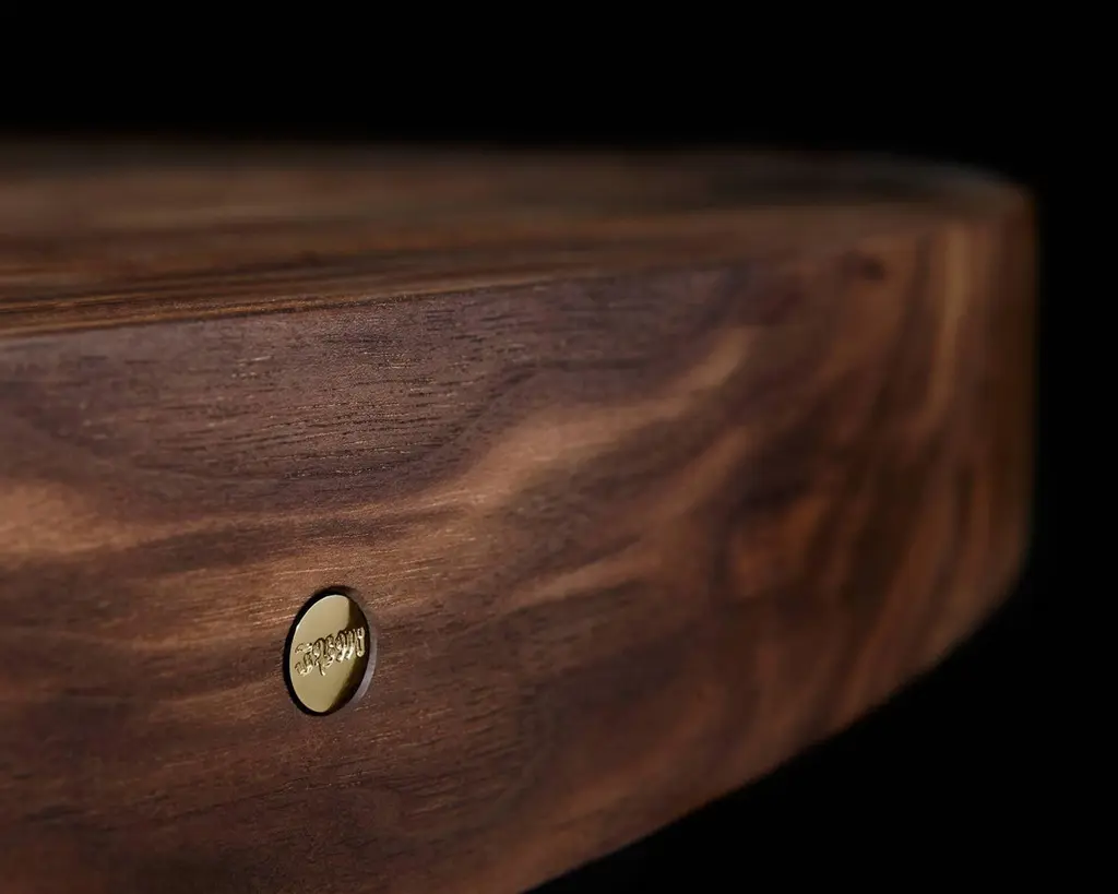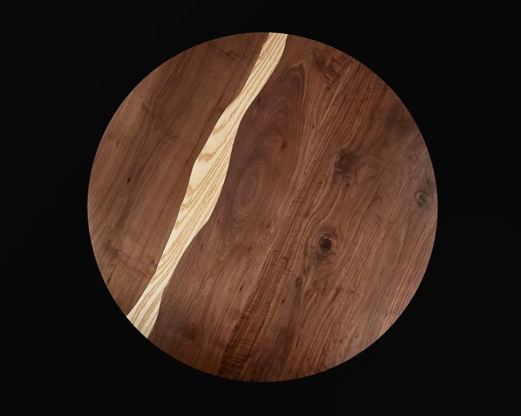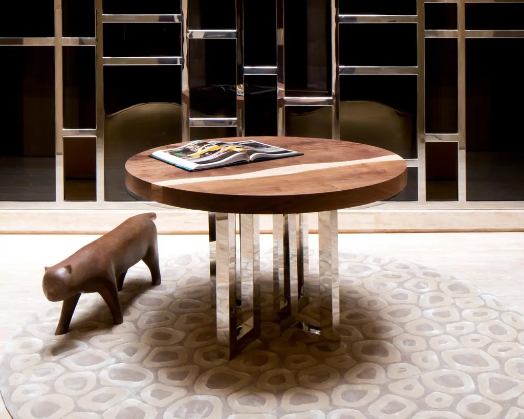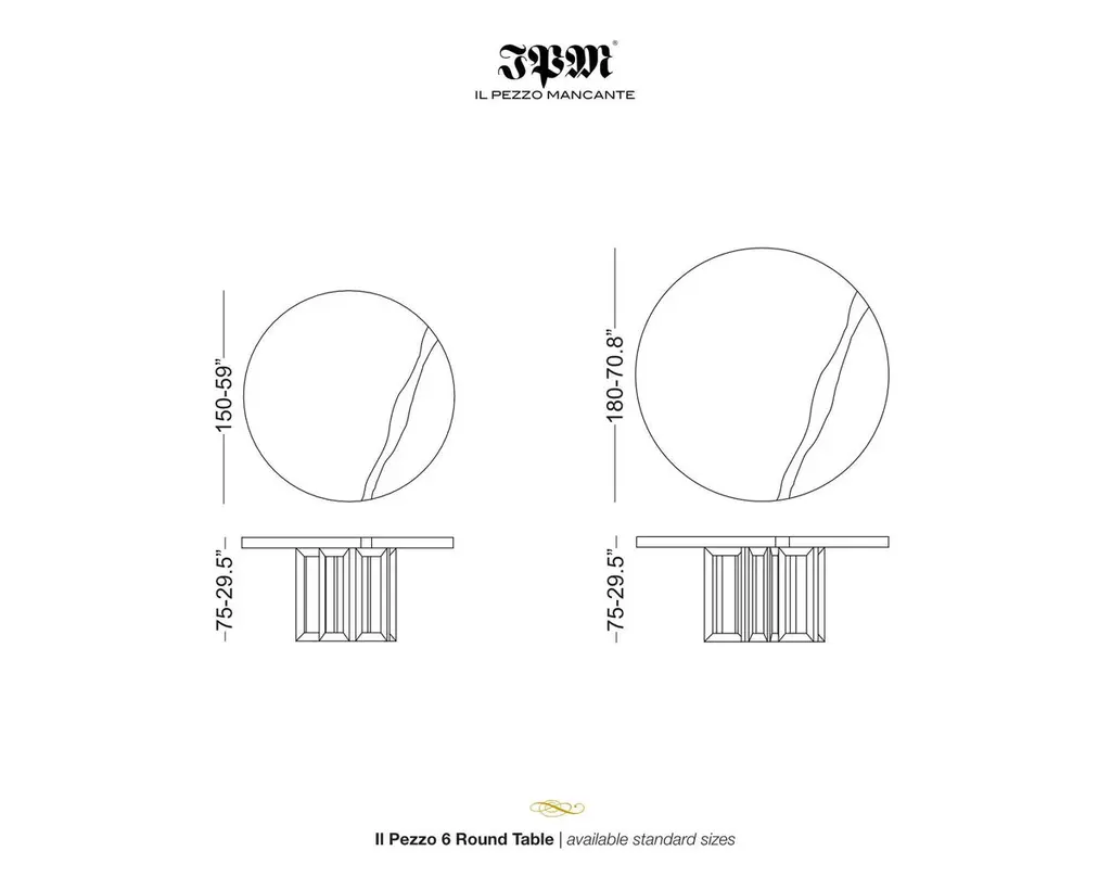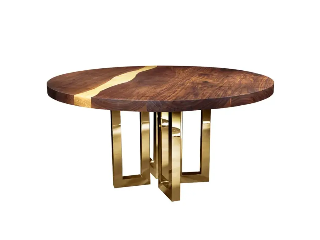 A solid block of walnut held up by what seems to be a casually arranged group of glittering legs. A composite of contrasting elements, massive and sophisticated, strong and passionate; Il Pezzo 6 Table is a harmonious and timeless whole.The tabletop is made of 7 cm thick solid walnut and it’s gently crossed by a vein which reminds a majestic river, made of solid ash or wenge stained solid wood. The choice of the wood grain alignment is done with great care to create flowing veins and colors.The treatment on the wood is done with natural oil that protects the wood but at the same time allows it breathe, leaving the extraordinary feel of this beautiful, natural material unchanged to the touch. Furthermore the final coat on the top is done with Nanotechnology, an organic silica- based natural treatment which makes the wood water repellent. The legs are mad of hand- welded brass, available in different finishes.Each table shows the “Missing Piece” (“Pezzo Mancante” in Italian): a small brass cylinder containing a unique serial number, guarantees its authenticity and individuality.Custom sizes and finishes are also available to suit every preference.All our masterpieces are meticulously crafted in our Atelier located in Florence, Italy, from a small team of people driven by a shared passion for quality and beauty. We constantly strive to create unparalleled works of art, where each piece is a testament to our commitment to craftsmanship and innovation.Top: solid walnut and solid ashBase: gold finish brassSize: diameter 150xH75 cm - diameter 59"xH29.5"