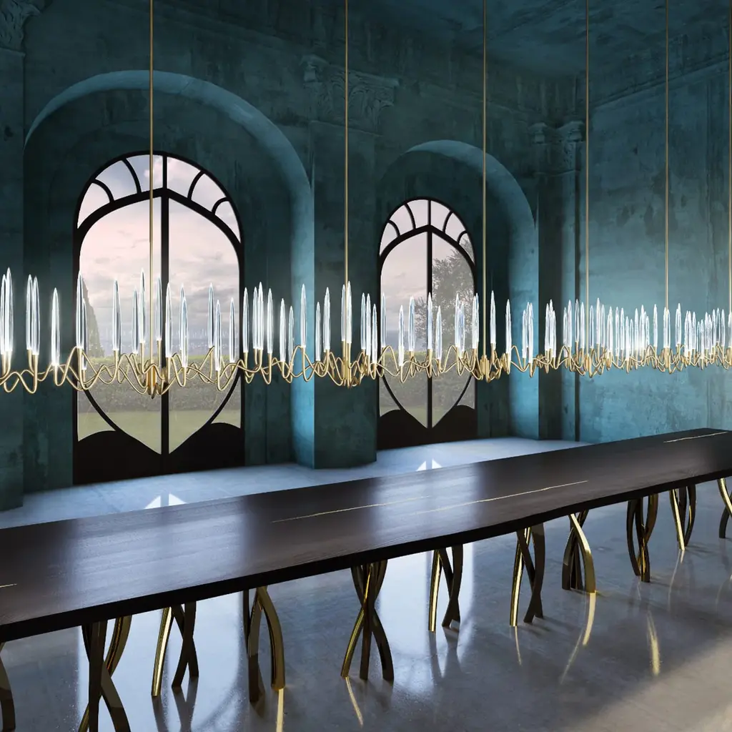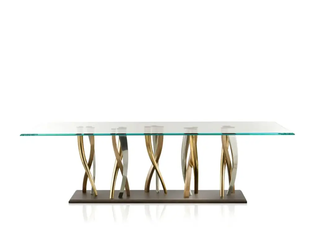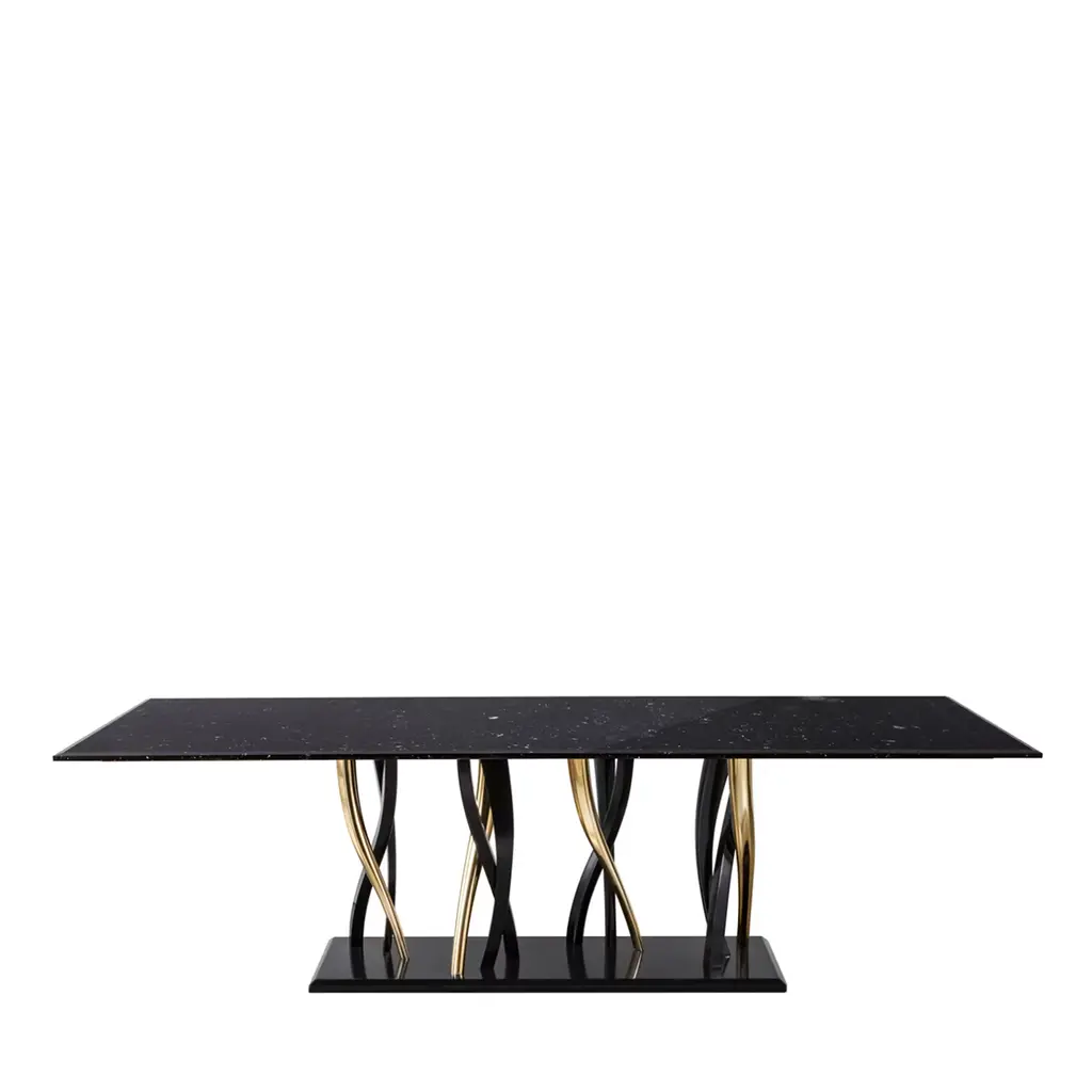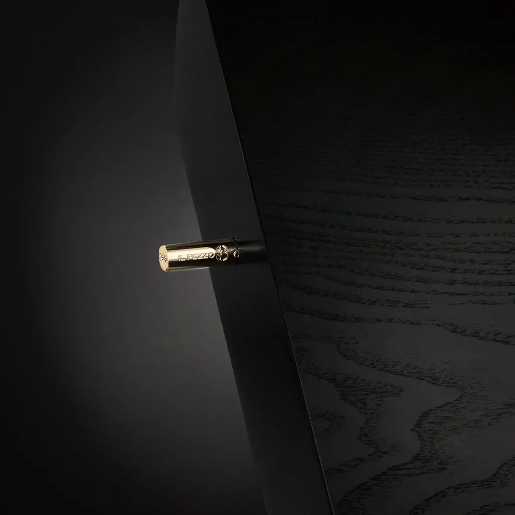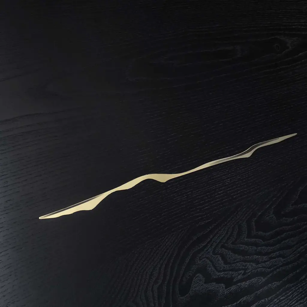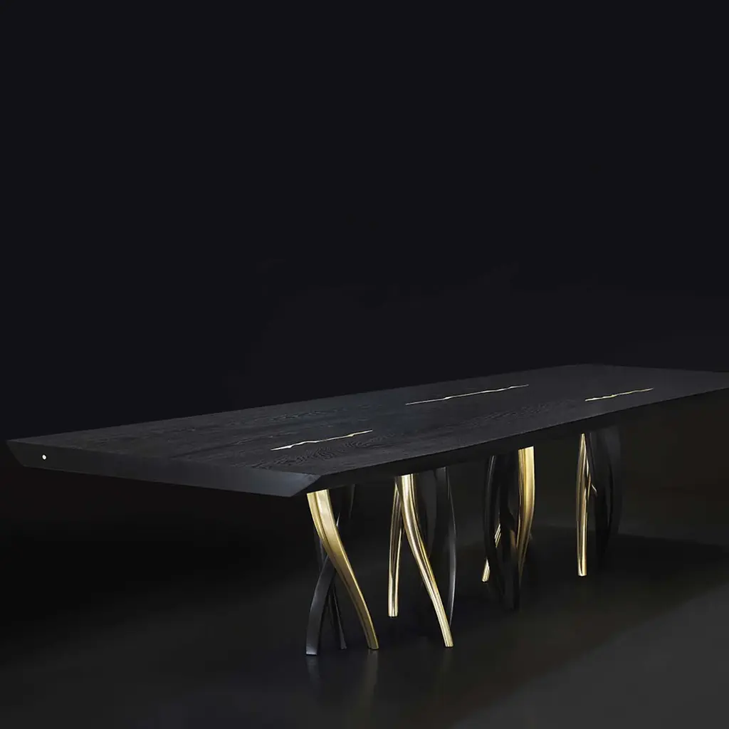 A sparkling forest of legs support a majestic block of solid wood with lively outlines. Il Pezzo 8 Black Table shows its black and gold colors as an eclectic, elegant match you can loose yourself in. It is sinuous and light and at the same time solid and rich.The wooden top is adorned with inlays made of polished brass: they remind us of the natural cracks in wood, filled and highlighted by a precious material that elevates the piece's overall beauty. Each table shows the “Missing Piece” (“Pezzo Mancante” in Italian): a small brass cylinder containing a unique serial number, guarantees its authenticity and individuality. Custom sizes are also available to suit every preference.
