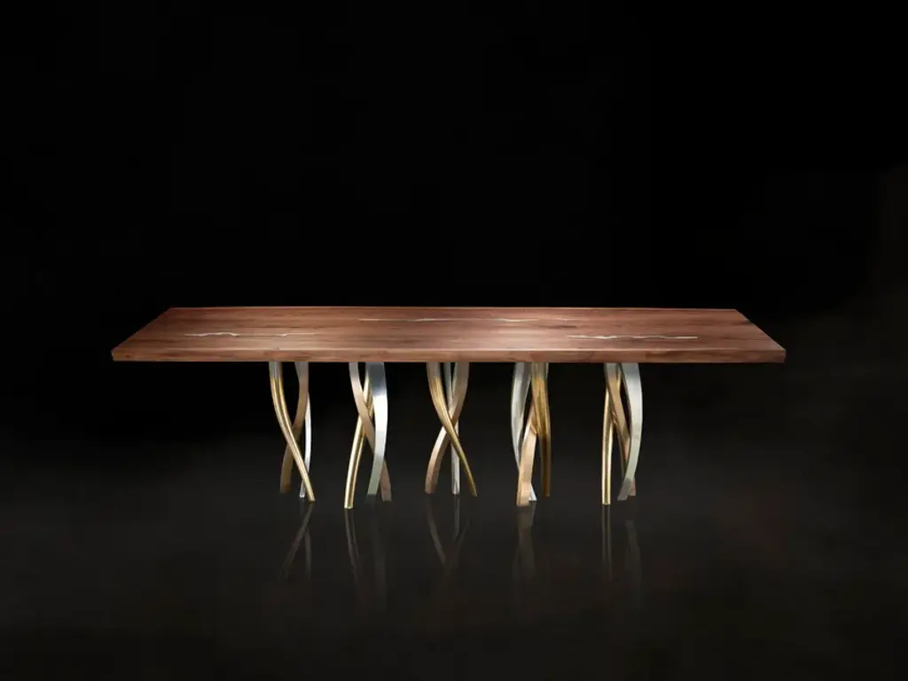 A sparkling forest of legs support a majestic block of wood with strong, lively outlines. Il Pezzo 8 is a collection of colour, shape and materials you can loose yourself in. It is romantic, sinuous and light and at the same time solid, rich and imposing. The tabletop has an organic shape, made of 7 cm thick solid walnut, with some inlays in nickel finish brass. The choice of the wood grain alignment is done with great care to create flowing veins and colours throughout the top. The treatment on the wood is done with natural oil that protects the wood but at the same time allows it breathe, leaving the extraordinary feel of this beautiful, natural material unchanged to the touch. Furthermore the final coat on the top is done with Nanotechnology, an organic silica-based natural treatment which makes the wood water repellent. The legs are made of casting and they are available in different finishes. Each piece is numbered: a small brass cylinder, containing serial number, seals the authenticity and uniqueness. Available in custom sizes and finishes.