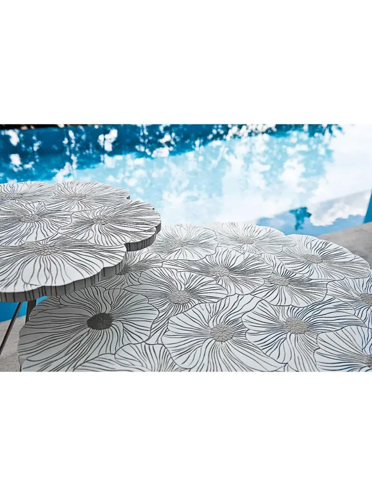 Bouquet coffee table by Kenneth CobonpueMaterials: fiberglass reinforced polymer and stainless steel.Dimensions: diameter 75cm x height 40cmAn exquisitely eye-catching centerpiece, Bouquet makes any day feel like a special occasion. The delicate lines of the signature floral relief pattern complete the contrasting resin top and stainless steel base.Also available in other sizes and colors.Designer's BiographyKenneth Cobonpue is a multi-awarded furniture designer and manufacturer from Cebu, Philippines. His passage to design began in 1987, studying Industrial Design at the Pratt Institute in New York. While completing his studies, he apprenticed for a leather and wood workshop near Florence, Italy. He went on to study Furniture Marketing and Production at the Export-Akademie Baden-Württemberg in Reutlingen, Germany, under a private and state scholarship program, and subsequently worked in Bielefeld and Munich.Kenneth returned home to Cebu in 1996 to manage Interior Crafts of the Islands, Inc., a furniture design and manufacturing company founded by his mother Betty Cobonpue in 1972. Discovering that modern design could have a new face using natural fibers and materials, Kenneth created pieces of functional art, offering an alternative to the Western definition of modern design. Today, the Kennethcobonpue brand has become known globally for its unique designs and extensive roster of clientele, including Hollywood celebrities and members of royalty.With his masterful way of integrating nature, traditional craft and innovative technologies, designer and creative director Kenneth Cobonpue has earned international awards and recognition for his creative, organic, and expressive pieces. Working closely with some of the world’s leading designers, from household names to emerging talents, Kenneth has been pushing the envelope for design in the Philippines and sharing his vision to a global audience. Awards to his credit include five Japan Good Design Awards, the grand prize at Singapore International Design Competition, the Design for Asia Award of Hong Kong, the American Society of Interior Design Top Pick selection and the French Coup de Coeur award. Several of his designs were selected for several editions of the International Design Yearbook published in London and New York. Phaidon’s book entitled “& FORK” underscores Kenneth’s position as a leader of a new movement incorporating new technologies with crafts. In 2007, TIME magazine called him “rattan’s first virtuoso”. Kenneth was named the Designer of the Year in the first edition of Maison et Objet Asia held in March 2014 in Singapore.Kenneth reveals new work each year in the design shows from Milan to New York, and he speaks regularly about Southeast Asian design all over the world. He has also appeared in European television and in countless international magazines and newspapers around the world. Various Cobonpue designs have also appeared in full-length feature films and television, such as Oceans 13 and CSI.