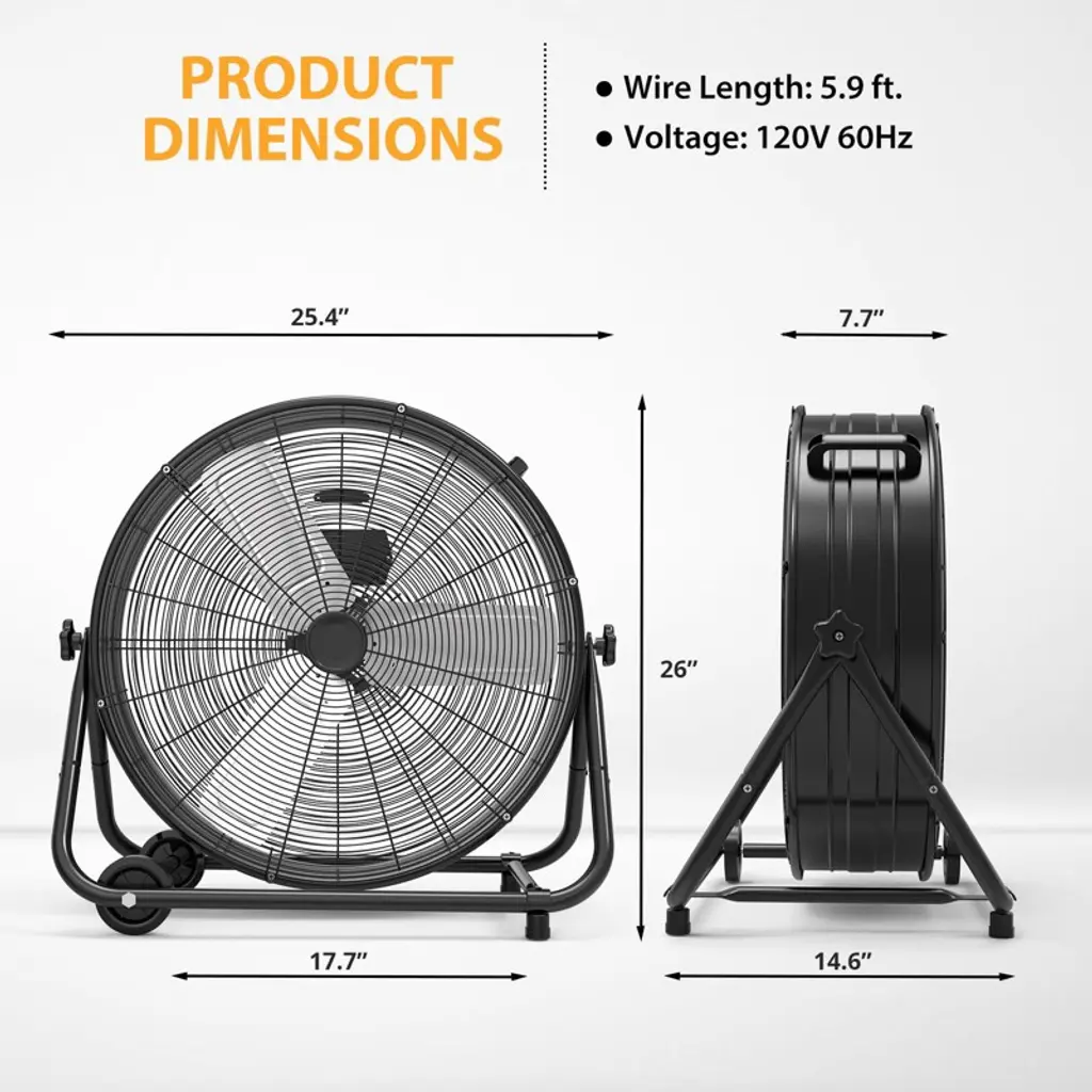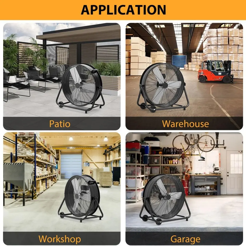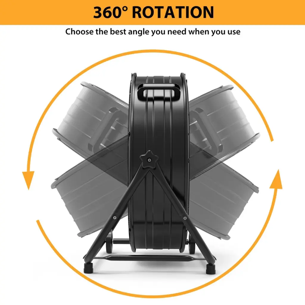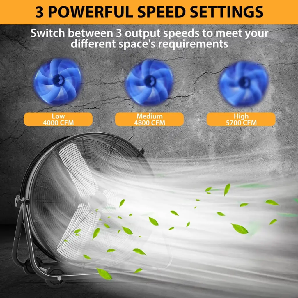1.Upgraded Copper Motor: Quiet Power & Long-Lasting DurabilityEngineered with a premium copper motor, this industrial floor fan stands out for both performance and longevity. Copper¡¯s superior conductivity ensures efficient energy use¡ªreducing electricity costs even during extended operation¡ªwhile its resistance to overheating prevents motor wear, extending the fan¡¯s lifespan far beyond fans with standard aluminum motors. What sets it apart is its whisper-quiet operation: the copper motor runs smoothly without the loud humming common in heavy-duty fans, making it suitable for diverse spaces. Whether you¡¯re using it in a workshop (where loud noise would disrupt concentration), an office (to keep employees cool without distractions), or a home garage (for weekend projects without disturbing family), it delivers powerful airflow without sacrificing a peaceful environment. 2.3-Speed Adjustable Airflow (4800¨C8800 CFM): Tailored Cooling for Every SpaceWith three distinct speed settings, this fan adapts to any cooling need, from gentle air circulation to rapid heat reduction. The low speed (4800 CFM) provides a soft, consistent breeze¡ªideal for offices, home basements, or small workshops where you want comfort without strong drafts. Medium speed (around 6800 CFM, derived from the 4800¨C8800 range) balances airflow and quietness, perfect for commercial spaces like retail backrooms or medium-sized warehouses where steady cooling is needed. High speed (8800 CFM) unleashes maximum power, quickly lowering temperatures in large industrial areas: think spacious warehouses, factory floors, or busy auto repair shops, where stagnant heat can affect productivity. The clear speed controls let you switch settings in seconds, ensuring you always have the right airflow for the moment. 3.360¡ã Dynamic Rotation & Flexible Tilt: Targeted Airflow Where You Need ItUnlike fixed-direction fans that only cool one area, this fan offers full 360¡ã rotation and adjustable tilt, letting you direct airflow precisely. The 360¡ã rotation means you can cover large, open spaces (like a 1000+ sq ft warehouse) without moving the fan¡ªsimply spin the drum to shift air from one zone to another. The tilt function adds vertical flexibility: angle the fan upward to cool high-ceilinged areas (preventing heat buildup near rafters), tilt it downward to focus on workbenches or equipment, or keep it level for even floor-to-ceiling circulation. This targeted design eliminates wasted airflow, ensuring every corner of your space stays cool¡ªwhether you¡¯re cooling a specific workstation in a workshop or distributing air evenly across a commercial storage area. 4.Portable Design: Handles & Casters for Effortless RelocationBuilt for mobility, this fan features two sturdy handles and four smooth-rolling rubber casters, making it easy to move even for one person. The handles (one on top, one on the side) provide secure grip points¡ªlift the top handle to steer, or use the side handle to tilt the fan slightly for easier rolling. The rubber casters glide seamlessly over various surfaces: concrete (warehouse floors), wood (workshop decks), or tile (commercial lobbies)¡ªno scratching or sticking. They also absorb small bumps, ensuring the fan stays stable during movement. Whether you need to shift it from a warehouse corner to a loading dock, move it from the garage to the patio for outdoor events, or reposition it in a workshop to cool a new project area, the portable design eliminates heavy lifting and strain. 5.User-Friendly Features: Simple Operation & Space-Saving BuildThis fan prioritizes convenience with thoughtful, easy-to-use details. The 3-speed switch is prominently located on the fan¡¯s side¡ªlarge, labeled clearly (Low/Medium/High), and easy to reach even when the fan is in use, so you don¡¯t have to fumble with small buttons or hidden controls. Its compact dimensions (27.2¡± x 8.07¡± x 27.6¡±) mean it fits in tight spaces: slide it between warehouse shelves, tuck it in a workshop corner, or store it in a closet when not needed¡ªno bulky footprint. The solid rubber casters add extra stability too: they grip the floor to prevent the fan from sliding during high-speed operation, even on slightly uneven surfaces. Together, these features make the fan accessible for everyone¡ªfrom DIY enthusiasts to warehouse staff¡ªcombining powerful industrial performance with hassle-free usability.