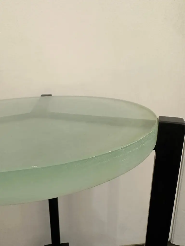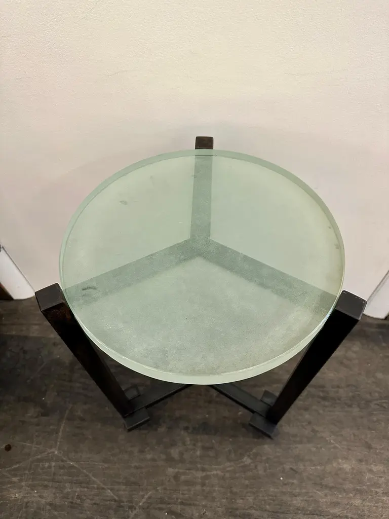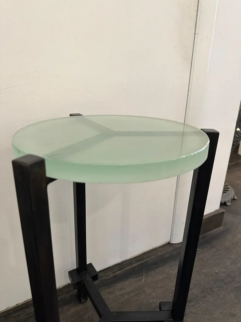 Custom studio designed heavy blackened iron bases with 19th Century 1" green sandblasted glass tops. Note: each glass top is minimally different in color variation and thickness. Exceptional craftmanship, heavy and solid.