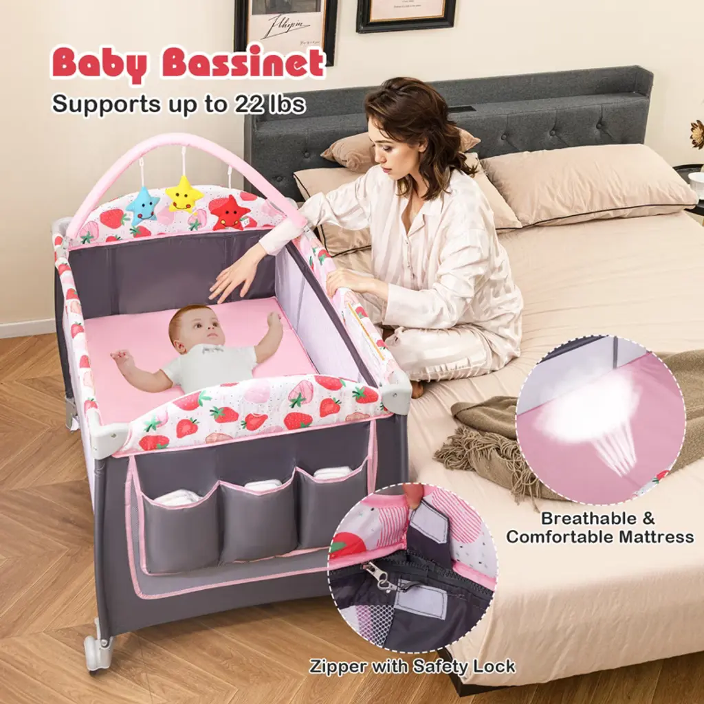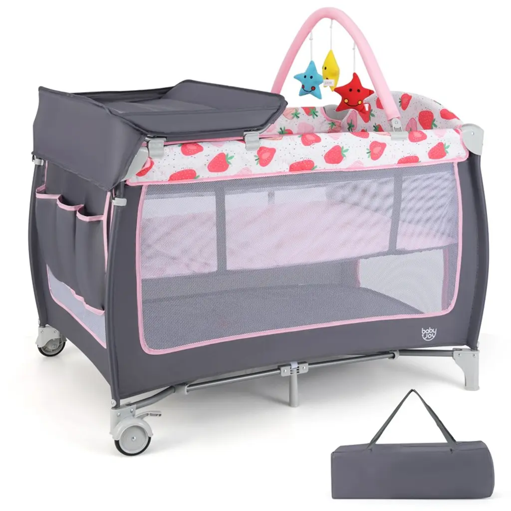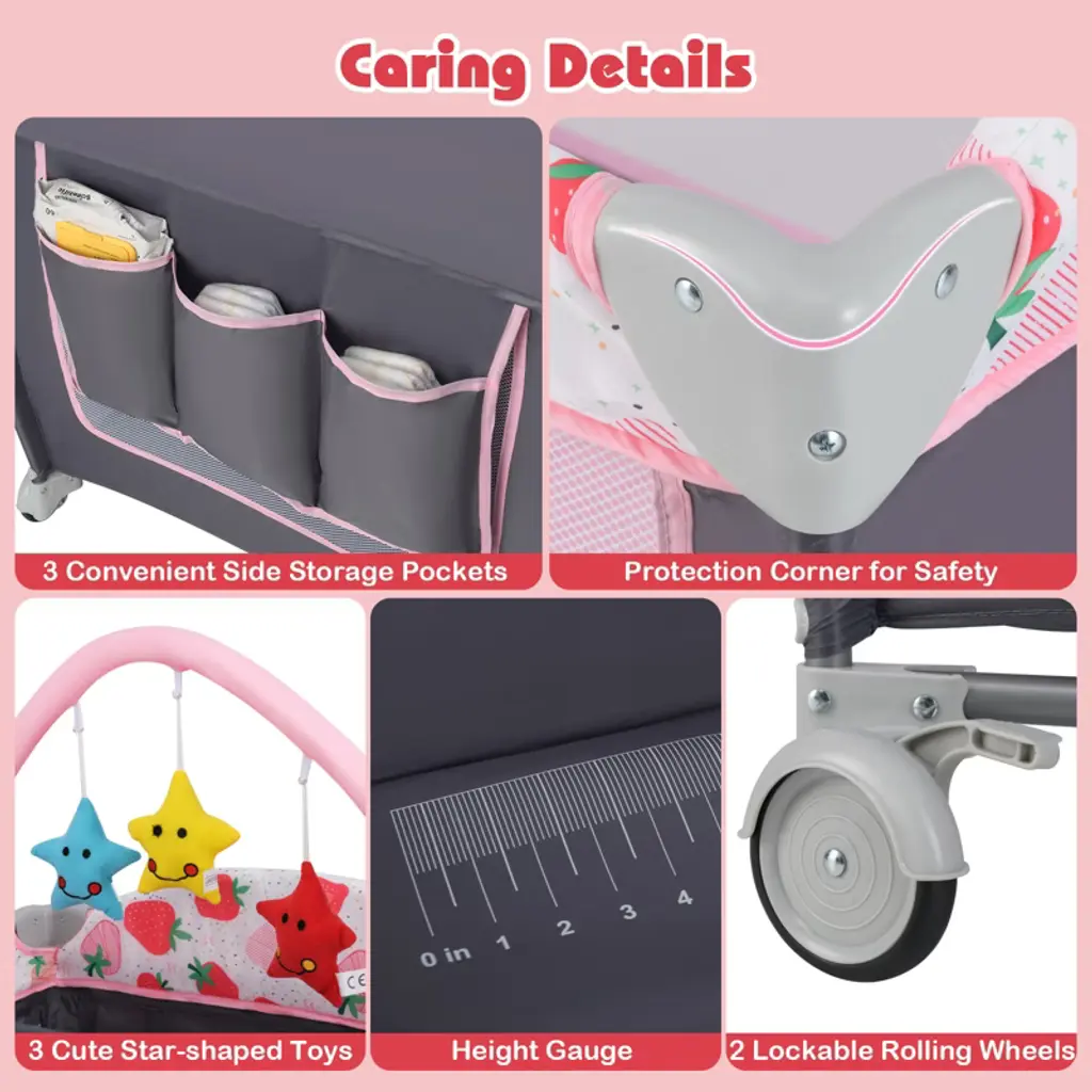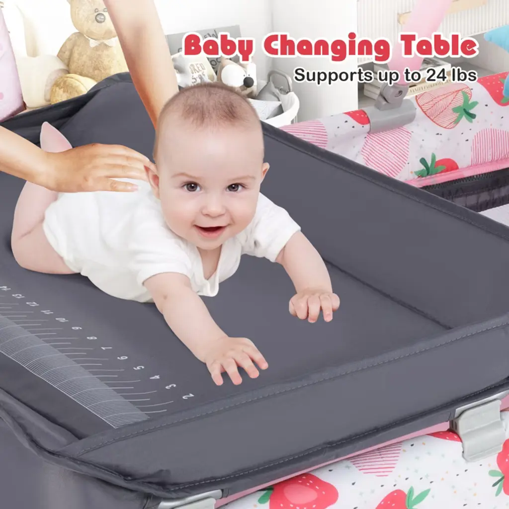 Made of solid iron pipe frame and resistant oxford cloth, this baby playard ensures great stability and long-lasting use. Combining a bassinet bed, diaper table and activity center, our baby playard can be used in various ways as well as accompany the growth of your baby. The diaper changing table is equipped with safety belt & height gauge. Plus, the breathable mesh netting is high enough to keep the baby in place and ensures great visibility for parents to observe the baby. The zippered side door offers baby easy access to the playpen. Besides, there are 2 casters with brakes for easy moving and relocation. The folding design makes the playpen easy to store and carry. You can take it anywhere with the carrying bag.Color: Colorful Material: Mesh, Oxford Cloth, Metal, Sponge Product Size: 43" x 32" x 32" (W x D x H) Diaper Table Size: 28" x 19" (W x D) Weight Capacity of Basic Playpen: 66 lbs Weight Capacity of Diaper Table: 24 lbs Weight Capacity of Baby Bassinet: 33 lbs Net Weight: 23.5 lbs Applicable Age: 0-3 Years Old Package Includes: 1 x Baby Playard 1 x Carrying Bag 1 x Instruction