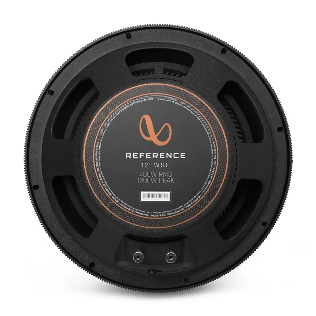 Infinity Reference shallow-mount subwoofers deliver deep powerful bass that will take your system to the next level. Using our proprietary cone design and high roll surrounds, they are extremely efficient and require less power to deliver the goods. The Infinity REFERENCE shallow-mount subwoofers are also happy in both sealed and bandpass box configurations, delivering powerful, punchy and accurate bass in all. They also feature SSI™ (Selectable Smart Impedance), an exclusive impedance switch that lets you select the optimum impedance, 2 or 4 ohms for your chosen amplifier and overall system layout. Features and Benefits SSI™ (Selectable Smart Impedance) Most car audio system designs call for 2- or 4-ohm impedance. Reference Series subwoofers feature an exclusive dual impedance switch that lets you choose either load impedance option depending on your particular system and amplifier choice. Aluminum Woofer Cone A proprietary aluminum woofer cone has been engineered to provide high output while maintaining its shape to full excursion to ensure low distortion and minimal unwanted audible acoustical artifacts. The end result is deep, full bass performance that is musical and impactful. High-Roll Rubber Surrounds Reference shallow-mount subwoofers incorporate a high-roll surround that provides superior cone edge suspension while maximizing excursion. It not only increases the cone area, it also provides remarkable linear stability and reliability. Technical Specifications Subwoofer: 12" (300mm) Aluminum Driver Power Handling: 400W RMS, 1200W peak Sensitivity (1W/1m): 84dB Frequency Response (-6dB): 30Hz – 400Hz Nominal Impedance: 2 or 4 ohms, switch-selectable Voice Coil Diameter: 2" (50mm) Cutout Diameter: 11" (279.04mm) Mounting Depth: 3-1/4" (82.5mm) What’s in the box 1x 12" Subwoofer 1x EVA Foam Gasket 1x Owner’s Manual
