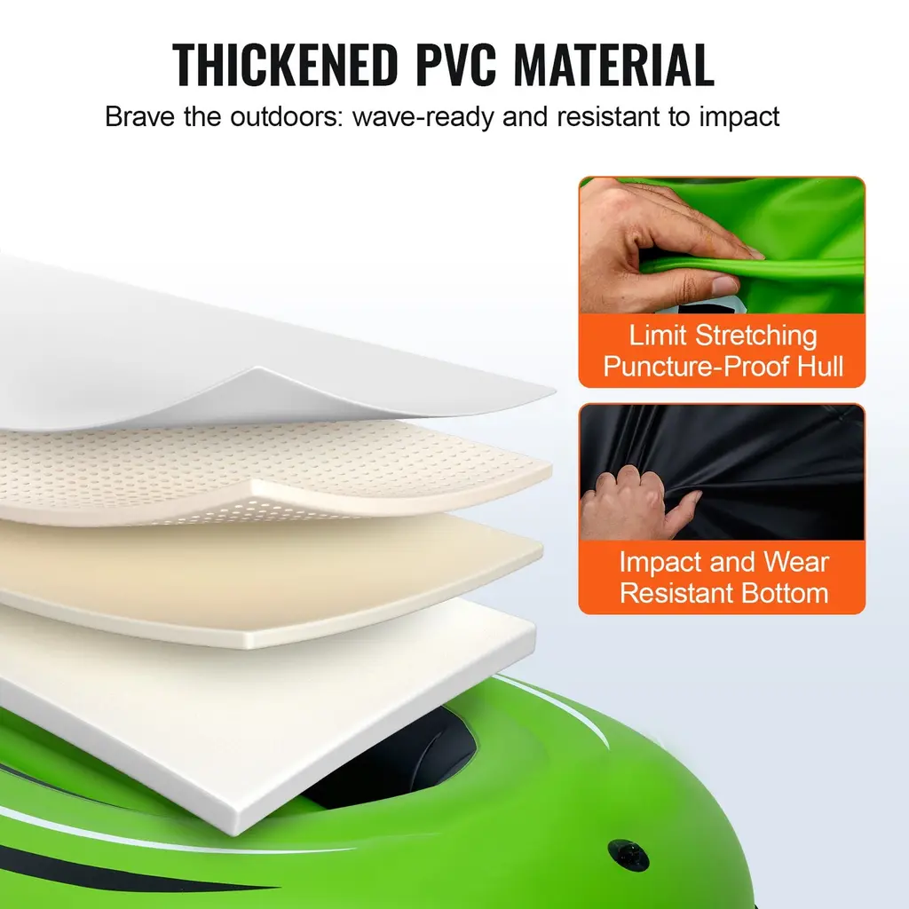 Two to Five-Person Capacity: This inflatable boat supports up to 1100 lbs (499 kg, 4-Person / 5-Person option) / 750 lbs (340 kg, 3-Person option) / 500 lbs (226.8 kg, 2-Person option), offering a spacious interior for comfortable seating and ample legroom. Easily foldable for storage, it fits in the trunk for convenient transport to your aquatic adventures, making it an ideal choice for water play and fishing. Enhanced PVC Durability: Constructed from thick, enhanced PVC, this inflatable raft boasts superior tensile strength and puncture resistance, ensuring reliable performance in marine conditions. Its large, thick base enhances stability and is designed to resist cuts and wear from sand when beached. Safety-Focused Design: Our inflatable fishing boat features 6 independent air chambers (4-Person / 5-Person option) / 4 independent air chambers (3-Person / 2-Person option) to enhance safety on the water. If one chamber is compromised, the others remain inflated, ensuring you can safely return to shore. Rust-Resistant Paddles Included: The inflatable dinghy boat kit comes with two extended, thick oars that resist deformation and breakage, allowing for efficient navigation with minimal effort. The aluminum alloy paddles with PP blades are built to withstand corrosion from saltwater. Package Content 1 x Inflatable Boat 2 x Oar Sets 1 x Pump 1 x Gear Pouch 2 x Air Nozzles 2 x Fishing Rod Holders 1 x Repair Kit 1 x 23 ft/7 m Grab Rope 1 x Vent Line 3 x Inflatable Seats (for 5-Person option) / 2 x Inflatable Seats (for 4-Person and 3-Person option)