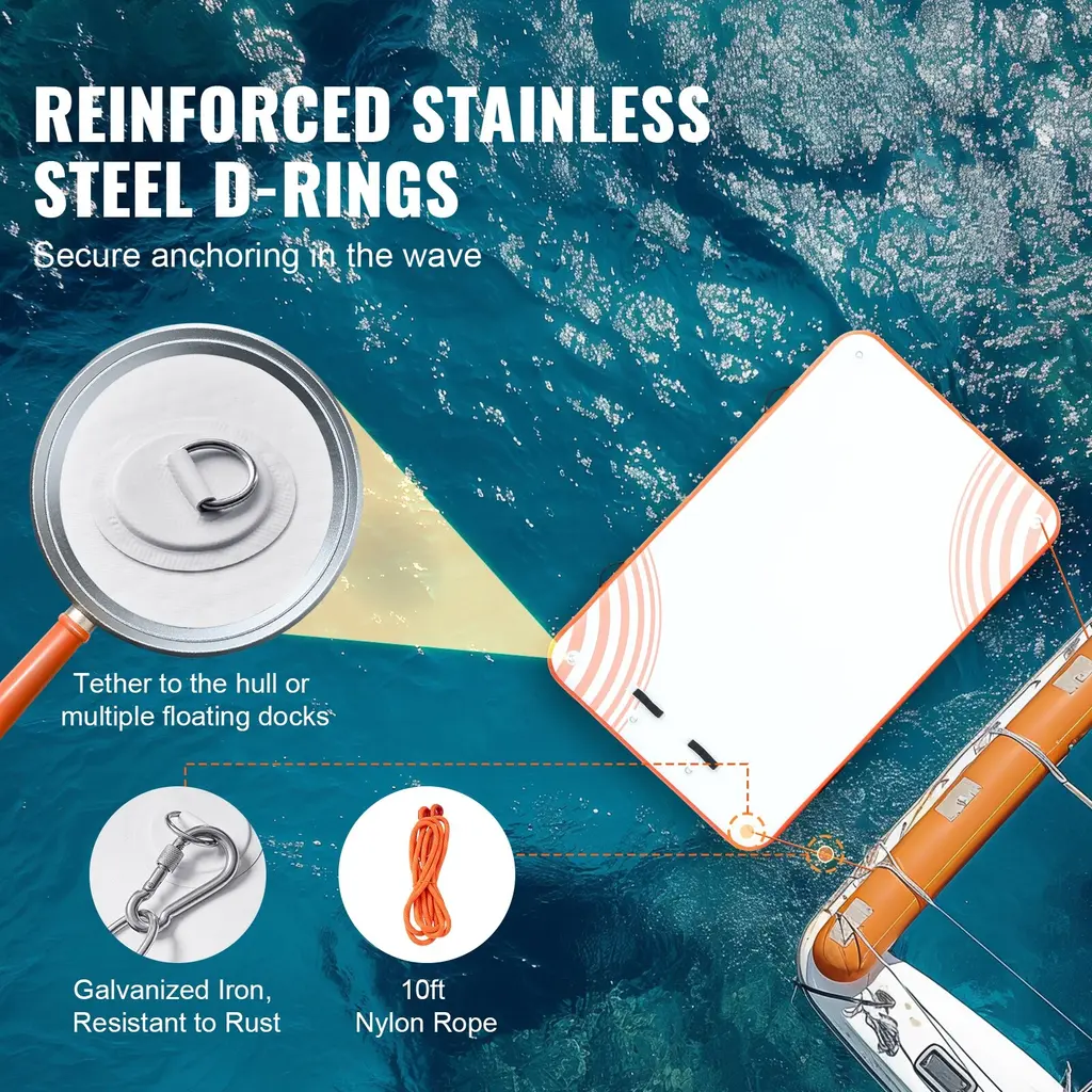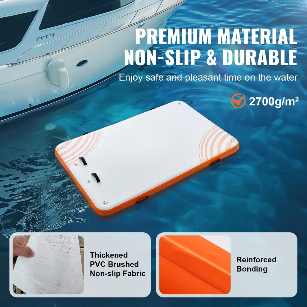 Enjoy Pleasant Water Fun: Immerse yourself in water activities with our inflatable floating dock! Engineered from high-density 2700g/㎡ PVC brushed fabric, it offers a non-slip and durable surface for stability and safety. The included dual-action hand pump with pressure gauge ensures quick and effortless inflation and deflation, making setup a breeze for all. Lightweight & Portable: Measuring 8*5 ft / 6*5 ft, our spacious floating dock platform offers ample space for relaxation. Lightweight and foldable, it can be effortlessly transported in the included carrying bag. With HR inflation valves, 6-inch thickened design and reinforced bonding, revel in secure playtime without breakage or leakage. Secure Anchoring, Happy Playtime: Stay anchored in peace with our reliable system. Featuring 6 stainless steel D-rings, 4 galvanized iron hooks, and a 10-foot nylon rope, our water floating dock mat remains steadfast in the water. Corrosion-resistant hooks guarantee durability, letting you enjoy endless water adventures. Convenient Soft Ladder Included: With a detachable four-step soft ladder, getting on and off the floating platform is a breeze. Perfect for kids and adults alike, it is especially suitable for those with weaker swimming abilities, making your water adventures more enjoyable and secure. Multi-Purpose Water Playground: From swimming, diving, and sunbathing to yoga and fishing, our floating island raft air mat offers endless possibilities for summer enjoyment. Ideal for family gatherings or solo relaxation, it's an ideal water playground to spend fantastic water playing time with friends and family. Package Content 1 x Nylon Rope 4 x Hook Anchors 1 x Dual-Action Hand Pump with Pressure Gauge 1 x Carry Bag 1 x Soft Ladder 1 x Woven Cable Tie