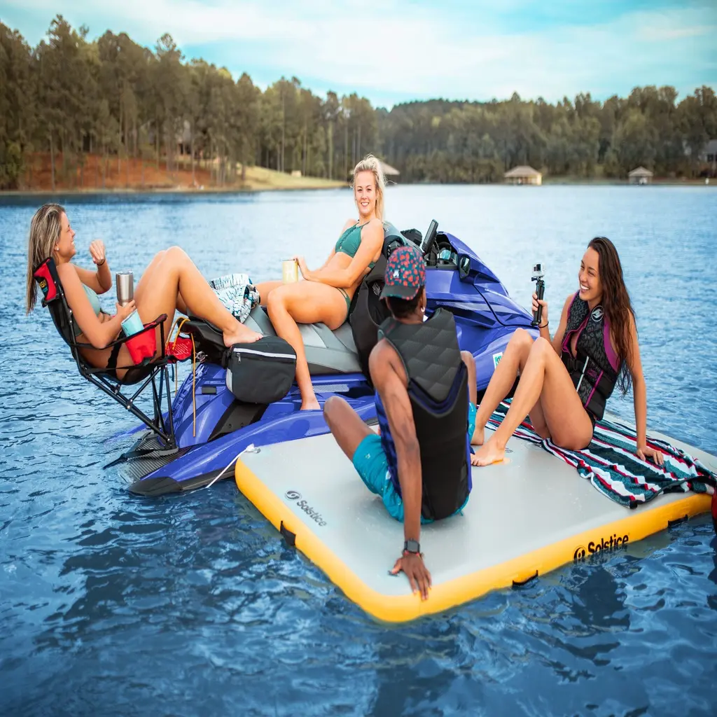 Create your own oasis with this floating dock. Add a cooler and an umbrella to simulate a resort feel or simply set up beach chairs and relax. Dive in the ocean while your belongings are secure and dry. Features: Solstice Drop Stitch Lake Dock The dock is white, yellow and black Can fit 4-6 people comfortably Features super rigid, high pressure, drop stitch construction 6 stainless steel D-ring tie downs 6 super strong, reinforced grab handles H3 high pressure valve for quick inflate/deflate Inflates between 8 and 12 PSI Inflate with high volume pump (or shop vac) Includes #19135 high pressure/high volume dual action pump with gauge Dimensions: 8 feet wide by 5 feet long Material(s): drop stitch Note:Photos picture various sized docks, however this listing is for an 8' x 5' dock