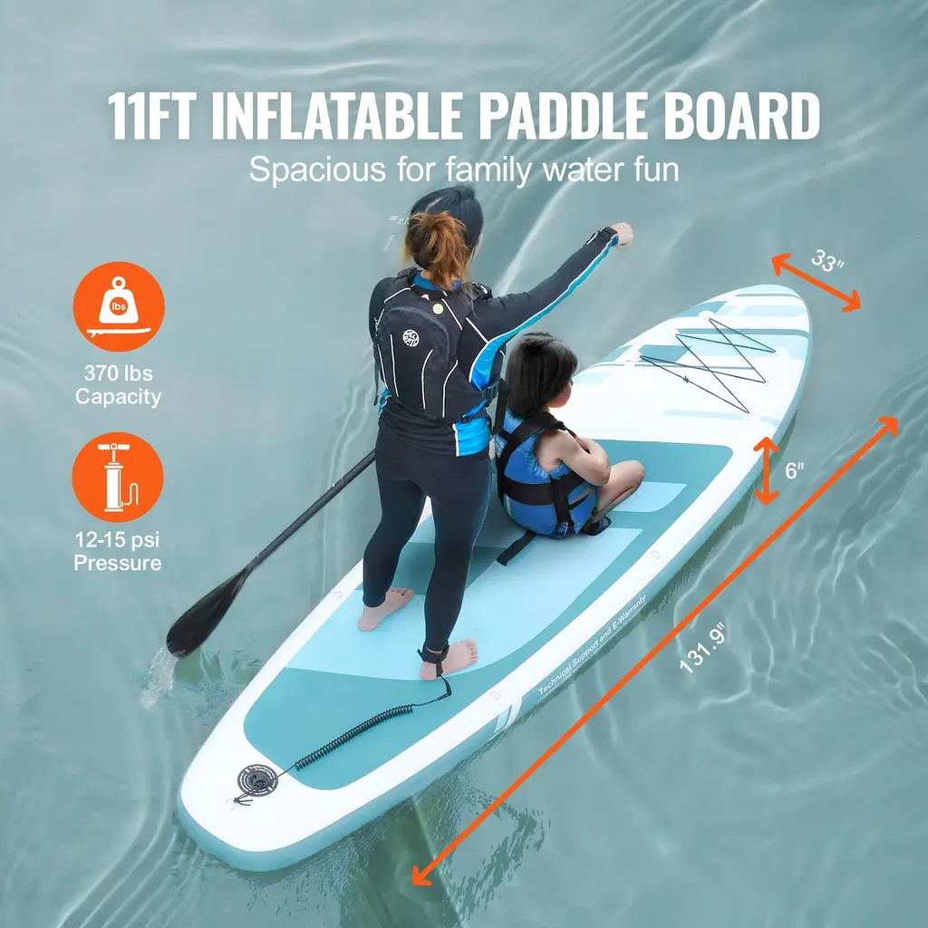 Extra Wide for Superior Balance: Our 11ft(for 11' x 33" x 6" option) / 10 ft(for 10' x 33" x 6" option) long, 33 inch/838.2 mm wide, and 6 inch/152.4 mm thick inflatable paddle board boasts a large surface area for exceptional balance and stability. With a load capacity of up to 370 lbs/167.8 kg, it's perfect for individual or family activities. A versatile solution for travel, entertainment, fishing, sunbathing, and yoga. Military-Grade Durability: Constructed from heavy-duty PVC and utilizing a high-quality wire drawing process internally, our inflatable stand up paddle board is designed to resist deformation and damage. Its thick PVC surface combats wave impact, saltwater corrosion, and sand abrasion while ensuring high air tightness. A non-slip deck pad on the surface provides added safety. Beginner-Friendly Features: Equipped with three beginner-friendly features for quick and safe mastery of the paddleboard. A detachable large tail fin provides flexible control, while the front streamlined head smooths over water to minimize instability caused by waves. For added safety, the ankle leash connects you securely to the board. Note: Beginners should start in calm waters. Easy to Carry & Quick Inflation: Achieve inflation (12-15psi) swiftly with the included high-quality air pump, easily connecting to the air valve for rapid inflation. The pressure gauge allows for precise monitoring. Lightweight and equipped with a carry handle, the inflatable sup is effortlessly portable, folding compactly into the provided accessory bag for travel. Comprehensive Accessory Set: The inflatable surf board has an aluminum paddle, air pump, dry bag, phone pouch, backpack, ankle leash, and wrench, ensuring you're fully equipped for your water adventures without needing extra gear. Package Content 1 x Paddle Board 1 x Pump 1 x Dry Bag 1 x Paddle 1 x Big Fin 1 x Phone Bag 1 x Backpack 1 x Repair Kit 1 x Ankle Leash 1 x Wrench 2 x Repair Patches 1 x Strap