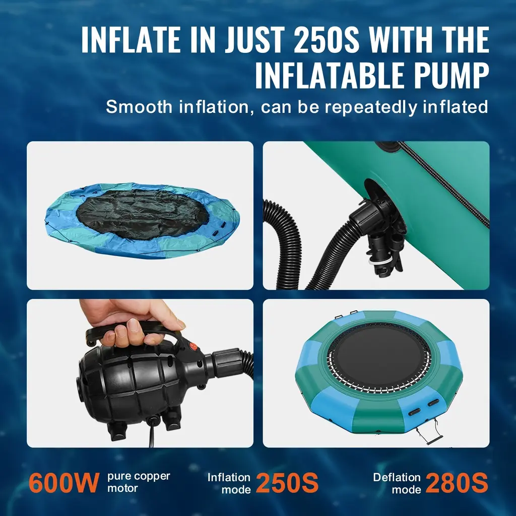 Inflatable Water Bouncer, Recreational Water Trampoline, Portable Bounce Swim Platform With Ladder & Electric Air Pump - 12ft - Blue & Green