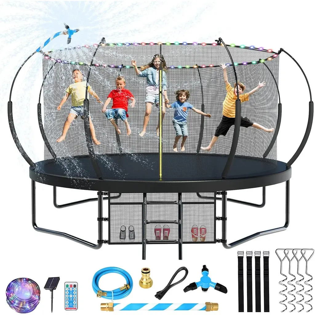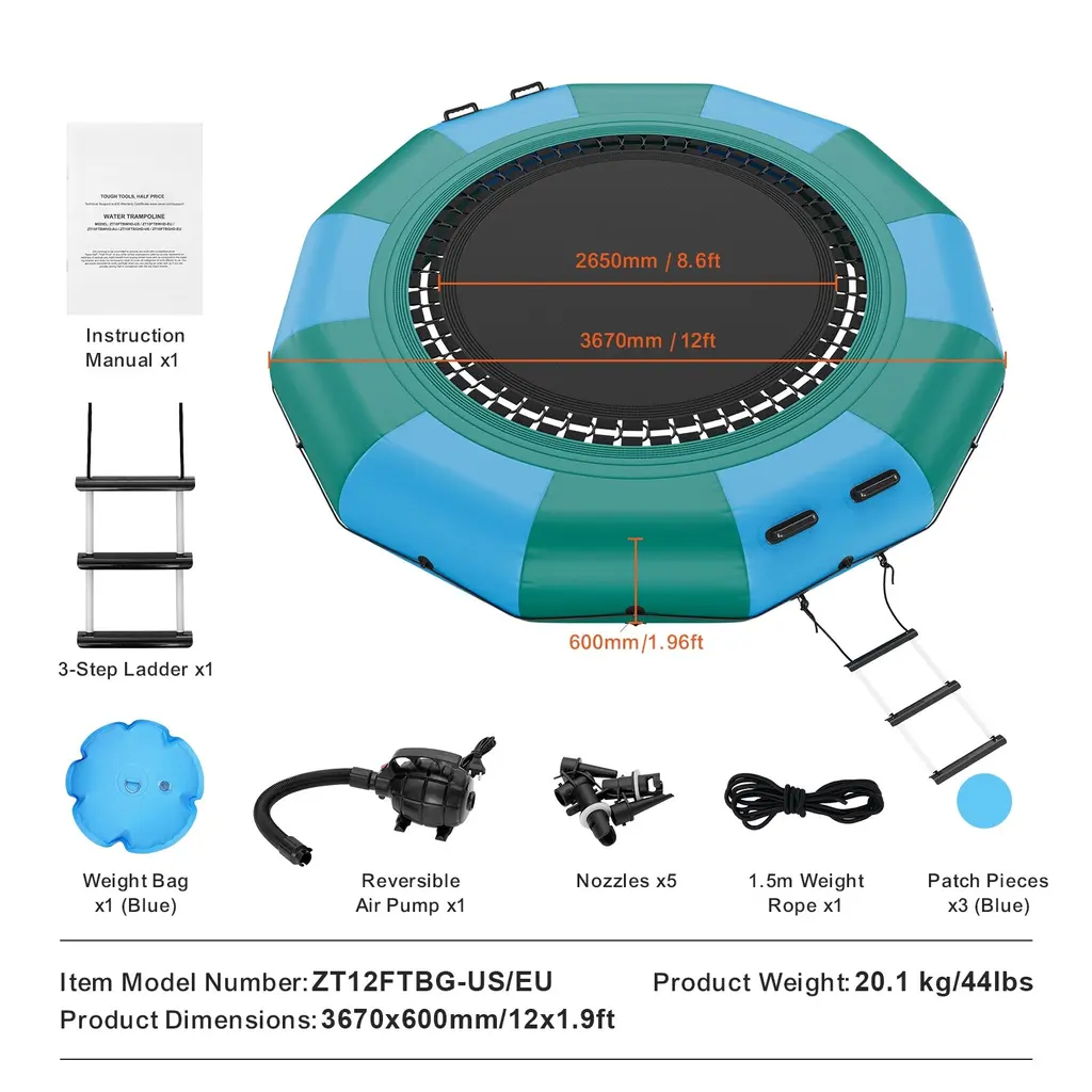 Large Bouncing Area: You can enjoy summer fun on a 10 to 15-feet large bouncing surface. The inflatable water trampoline provides excellent elasticity for your water activities with no spring bungee cords and interlocking nylon webbing pads. With a maximum weight capacity of 185 kg/408 lbs (for 10-feet option) / 226 kg/498 lbs (for 12-feet and 13-feet option) / 360 kg/794 lbs (for 15-feet option) / 450 kg/992 lbs (for 17-feet option), it can entertain 1-3 children at a time. The water trampoline is an excellent platform for water sports. Durable Thick Materials: The recreational water bouncer uses 1000D thick PVC mesh fabric, with a smooth waterproof surface that is fire-resistant, cold-resistant, heat-resistant, and aging-resistant. It is designed in two vibrant colors. The bungee cords and five-layer stitching are tightly intertwined, providing greater stability and minimizing gaps, effectively preventing foot entanglement during play. Multiple spare bungee cords can be flexibly adjusted. An auxiliary rope makes trampoline safer for children to use. Quick Inflation: Easily inflate or deflate with a high-speed inflation/deflation pump, allowing you to enjoy a fantastic summer in just a few minutes. Equipped with a 600w pure copper motor inflation pump, the inflation process won't be interrupted, and the same pump can be used for both inflation and deflation. The portable bounce swim platform is easy to transport after deflation, so it's recommended to inflate it at the play location. Easy Setup: The water trampoline for lake comes with complete accessories, including anchor ropes *1, anchor bags *1, patch stickers *3, 3-step ladder *1 (for 17ft option: 5-step ladder), air nozzles *5, and a reversible air pump *1. The installation and usage process are straightforward. With built-in handles, moving the product is convenient. The included anchor bags and 304 metal anchor buckles help secure it in place, ensuring stability. User-Friendly Design: The large wave handles provide a comfortable grip and excellent friction. The addition of warning labels encourages proper product usage, extending its lifespan. The enlarged ladder area ensures comfortable and safe climbing, allowing you to relax or sunbathe on the trampoline with ease. The floating trampoline can be placed on any water surface, such as lakes, oceans, swimming pools, etc., just be cautious to avoid sharp objects. Package Content 1 x Water Trampoline 1 x 1.5m Weight Rope 1 x Weight Bag (Blue) 3 x Patch Pieces (Blue) 1 x Reversible Air Pump 5 x Nozzles 1 x Ladder 1 x Instruction Manual