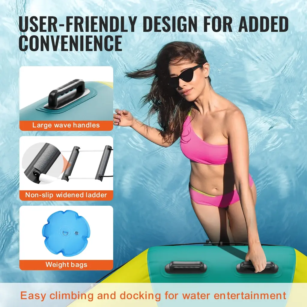 Large Bouncing Area: You can enjoy summer fun on a 10 to 15-feet large bouncing surface. The inflatable water trampoline provides excellent elasticity for your water activities with no spring bungee cords and interlocking nylon webbing pads. With a maximum weight capacity of 185 kg/408 lbs (for 10-feet option) / 226 kg/498 lbs (for 12-feet and 13-feet option) / 360 kg/794 lbs (for 15-feet option) / 450 kg/992 lbs (for 17-feet option), it can entertain 1-3 children at a time. The water trampoline is an excellent platform for water sports. Durable Thick Materials: The recreational water bouncer uses 1000D thick PVC mesh fabric, with a smooth waterproof surface that is fire-resistant, cold-resistant, heat-resistant, and aging-resistant. It is designed in two vibrant colors. The bungee cords and five-layer stitching are tightly intertwined, providing greater stability and minimizing gaps, effectively preventing foot entanglement during play. Multiple spare bungee cords can be flexibly adjusted. An auxiliary rope makes trampoline safer for children to use. Quick Inflation: Easily inflate or deflate with a high-speed inflation/deflation pump, allowing you to enjoy a fantastic summer in just a few minutes. Equipped with a 600w pure copper motor inflation pump, the inflation process won't be interrupted, and the same pump can be used for both inflation and deflation. The portable bounce swim platform is easy to transport after deflation, so it's recommended to inflate it at the play location. Easy Setup: The water trampoline for lake comes with complete accessories, including anchor ropes *1, anchor bags *1, patch stickers *3, 3-step ladder *1 (for 17ft option: 5-step ladder), air nozzles *5, and a reversible air pump *1. The installation and usage process are straightforward. With built-in handles, moving the product is convenient. The included anchor bags and 304 metal anchor buckles help secure it in place, ensuring stability. User-Friendly Design: The large wave handles provide a comfortable grip and excellent friction. The addition of warning labels encourages proper product usage, extending its lifespan. The enlarged ladder area ensures comfortable and safe climbing, allowing you to relax or sunbathe on the trampoline with ease. The floating trampoline can be placed on any water surface, such as lakes, oceans, swimming pools, etc., just be cautious to avoid sharp objects. Package Content 1 x Water Trampoline 1 x 1.5m Weight Rope 1 x Weight Bag (Blue) 3 x Patch Pieces (Blue) 1 x Reversible Air Pump 5 x Nozzles 1 x Ladder 1 x Instruction Manual