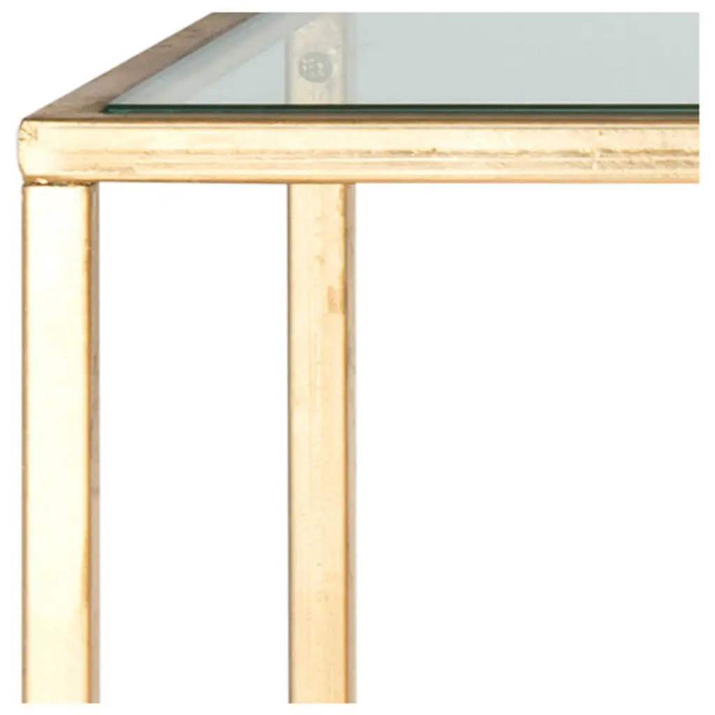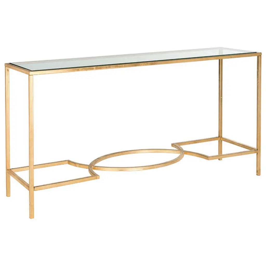 The Inga Console Table from Safavieh makes it simple to create a bold, vibrant living room. This exceptionally constructed console table boasts a straight-lined frame and curvaceous stretcher that helps the table sparkle. Plus, the table is crafted of solid iron in a gold leaf finish that dazzles, while its tempered glass top offers a smooth, elegant surface. Choose a world-class console table that you can enjoy for years to come -- the Inga Console Table.