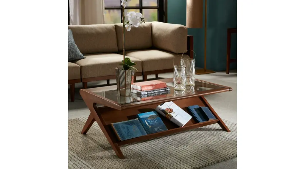 Create a unique living room display with the INK+IVY Rocket Coffee Table with Tempered Glass. This rectangular coffee table features a unique angular design in a pecan finish with a tempered glass table top, for a warm mid-century look. An angled lower shelf provides plenty of space to perfectly display your magazines. With its sleek and clean design, this coffee table adds a one-of-a-kind update to your living room.Size :1 Coffee Table:45"W x 27"D x 16"HShelf Size:42.5"W x 13.25"DMaterial:Rubber Solid Wood frame, Birch veneer on MDF, GlassFeatures:Solid wood framePecan wood finishTempered glass topAngular lower storage spaceDo not place hot items directly on the tabletopUse coasters, placemats or trivets to help prevent marks or stains