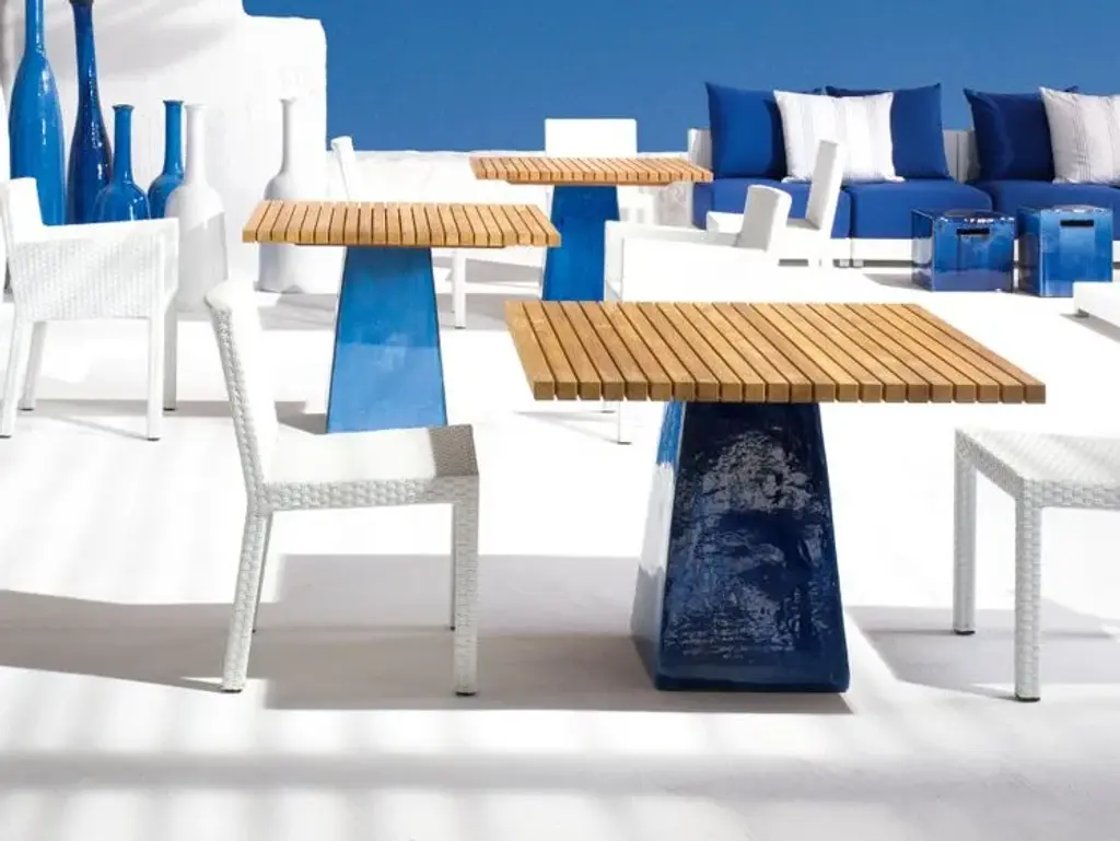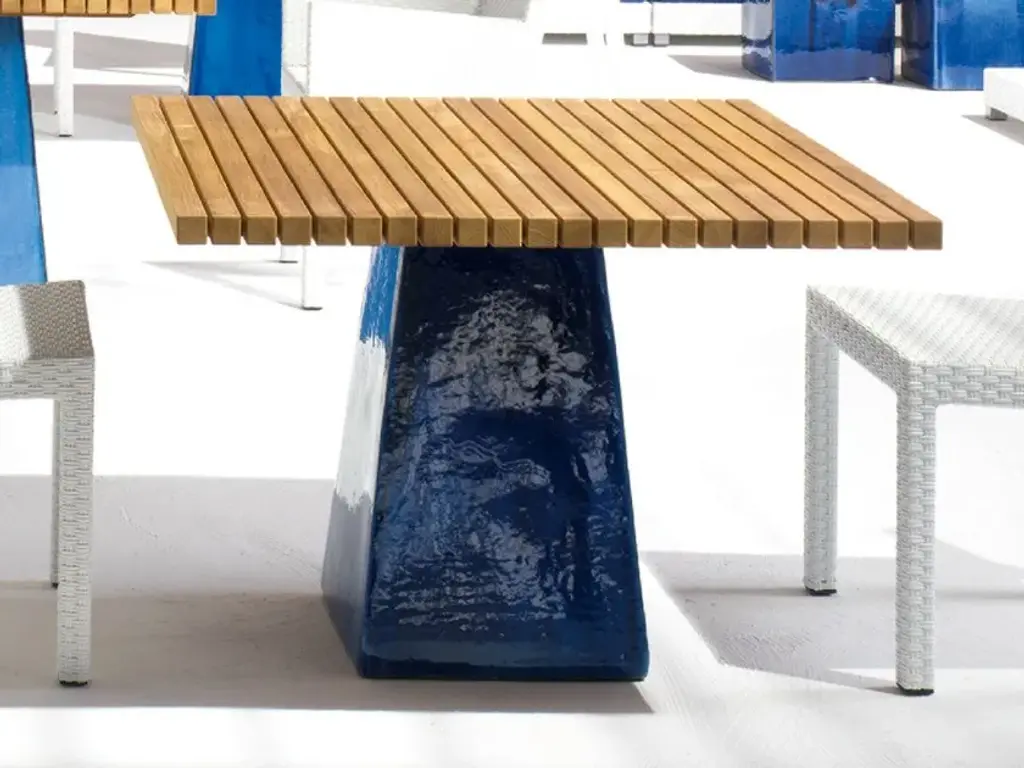 Inout 35 is the table with teak slats top, central base in blue, white or anthracite grey ceramic.Family of tables born from the union of natural and latest generation materials, Inout 33/34/35 are available in different sizes: with rectangular or square tops of various sizes. They are made with a top in natural teak slats and legs in blue, white or anthracite grey concrete GFRC, rectangular or trapezoidal in shape. In addition, the tables with rectangular top, having larger dimensions, also have a steel supporting structure.Inout is a broad and varied collection of chairs, stools, armchairs, sofas, tables, occasional tables, and accessories portraying the countless ways Gervasoni imagines spending time outdoors. Exotic suggestions are alternated with elements of sophisticated essentiality. Traditional outdoor materials such as wood, worked to enhance its natural properties, are paired with latest generation ones specifically designed to withstand weathering, but no less seductive and poetic. Even the weaving tradition is re-interpreted to resist against water and sunlight, maintaining its technical characteristics and colours unaltered over time.The Gervasoni Outdoor collection is the result of a careful selection of natural and technical materials worked with skillful craftsmanship and innovative technologies. The company’s products adapt to different styles of outdoor living, furnishing – with absolute ease, elegance and free customisation – terraces, gardens or swimming pools, from the most urban and contemporary to the most sophisticated or surrounded by nature. Each place has its own unique character that must be respected and enhanced. The key features of the range are, as always, attention to detail, excellent workmanship and in-depth research into materials.