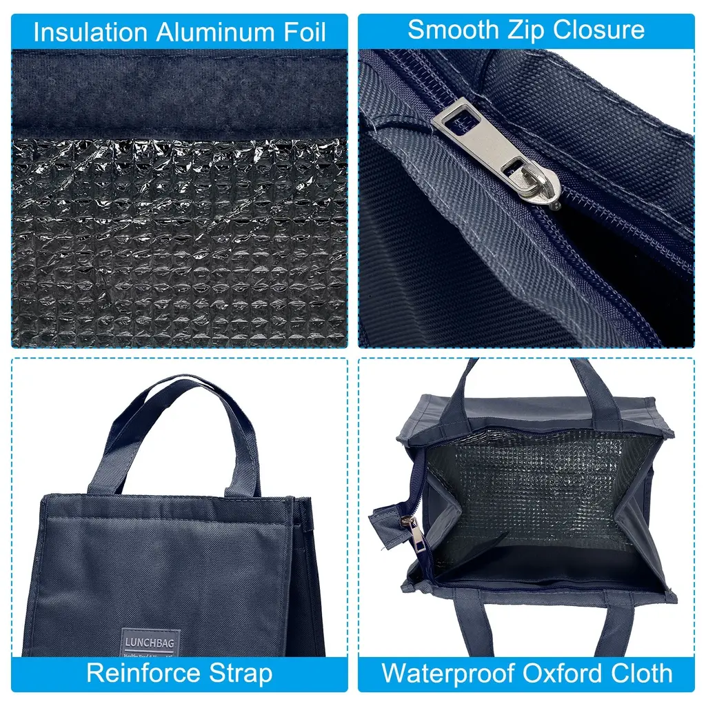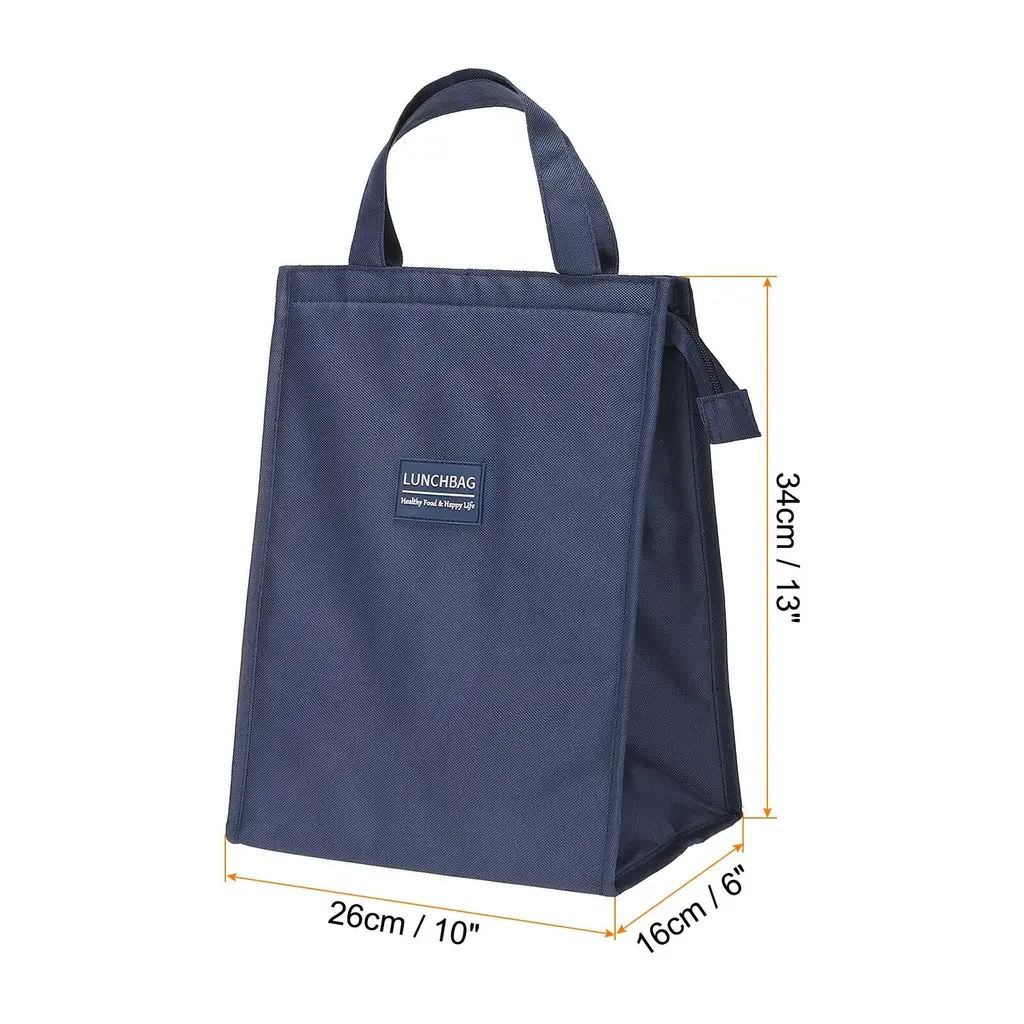 The insulated lunch bag is very suitable for office workers, outdoor workers, personnel, etc. to store lunch boxes, sandwiches, snacks, stew cups, bowls, etc., and can also be used for outdoor activities such as picnics and camping.SpecificationColor: Dark BlueMaterial: Oxford Cloth, Aluminum FoilSize: 26 x 16 x 34 cm / 10 x 6 x 13 inch (L*W*H)Packing List: 1pcs x Insulated Lunch BagAdvantageThe lunch bag is made of waterproof Oxford cloth and an aluminum foil insert, which is durable and tear-resistant. The interior is equipped with thermal insulation cotton and aluminum foil to avoid heat and effectively keep warm and cold.The top zipper and the hook-and-loop fastener are easy to open and close. Equipped with a hand strap, it has a strong bearing capacity and is easy to carry.InstructionThe insulated lunch bag is lightweight and portable, and fits easily in a backpack or tote, making it perfect for storing food on the go.NOTE: Please make sure the size is correct before placing an order.