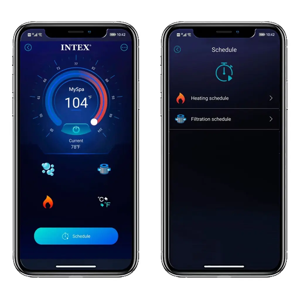 Let your worries bubble away as you unwind in the Intex PureSpa Plus Portable Inflatable Hot Tub with a PureSpa Maintenance Accessory Kit. The PureSpa provides relaxation at the touch of a button for up to 6 people with its easy-to-use control panel that activates 140 high-powered bubble jets surrounding the interior of the spa for a refreshing massage. Schedule when you want the spa to be heated and control the temperature with the Intex smartphone app. This particular PureSpa also features built-in LED lighting, headrests, and a built-in hard water treatment system that reduces calcium buildup to keep your spa time comfortable. The included spa cover is up to 50 percent more energy efficient than standard covers and protects the spa from damage. Keep your PureSpa clean and long-lasting for years to come with the Intex Spa Maintenance Kit. This maintenance kit works well for all spas and includes a curved brush, durable mesh skimmer for leaves and other debris, and scrubber pad to help remove tough dirt and grime from your inflatable PureSpa. Enjoy your hot tub with hassle-free maintenance with the Intex PureSpa Plus Portable Inflatable Hot Tub with a PureSpa Maintenance Accessory Kit.