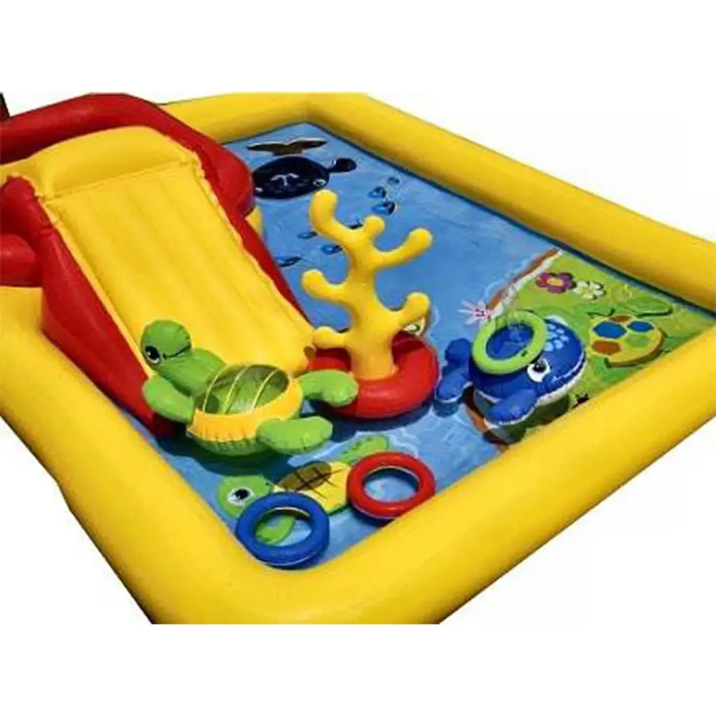 If you need some vitamin sea, the Intex Ocean Play Center Pool is the place to be. This summer, set up this over-8-feet oceanic play center pool for your kids and let them soak up the sun and imagine they're on a warm ocean island as they splash and play around. The Ocean Play Center is an island of fun with a water slide, inflatable palm tree, turtle and whale toys, ring toss game, and a built-in sprayer. The water sprayer easily attaches to your garden hose to keep your little beach bums cool. The wading pool allows for 4.5 inches of water and the main pool allows for 9 inches of water. The slide is super fun and has a comfortable landing pad at the bottom. This water play center is made of heavy-duty vinyl with a vinyl liner and provides an ocean scene for your kids season after season. Drain the pools with a tug of the integrated plugs for quick draining. Your little ones can swim in paradise and experience the ocean-atmosphere in your backyard with the Intex Ocean Play Center Pool. Provide your kids with oceans of fun within this giant inflatable ocean-inspired play center pool Wading pool allows for 4.5 inches of water while the main pool allows up to 9 inches of water Shallow pool water height is ideal for everyone to play in or swim Water sprayer attaches to garden hose to keep kids cool in summer Includes: water slide, inflatable palm tree, turtle and whale toys, ring toss game, built-in sprayer, repair patch kit Control valve adjusts water flow for optimum fun and cool comfort Drain plugs in both pools for easy draining and tear down Heat-sealed seams are strong enough to handle excited play Material: Vinyl Color: Yellow Dimensions (L x W x H): 100 x 77 x 31 inches Weight: 14.8 pounds Manufacturer warranty: 30-day warranty