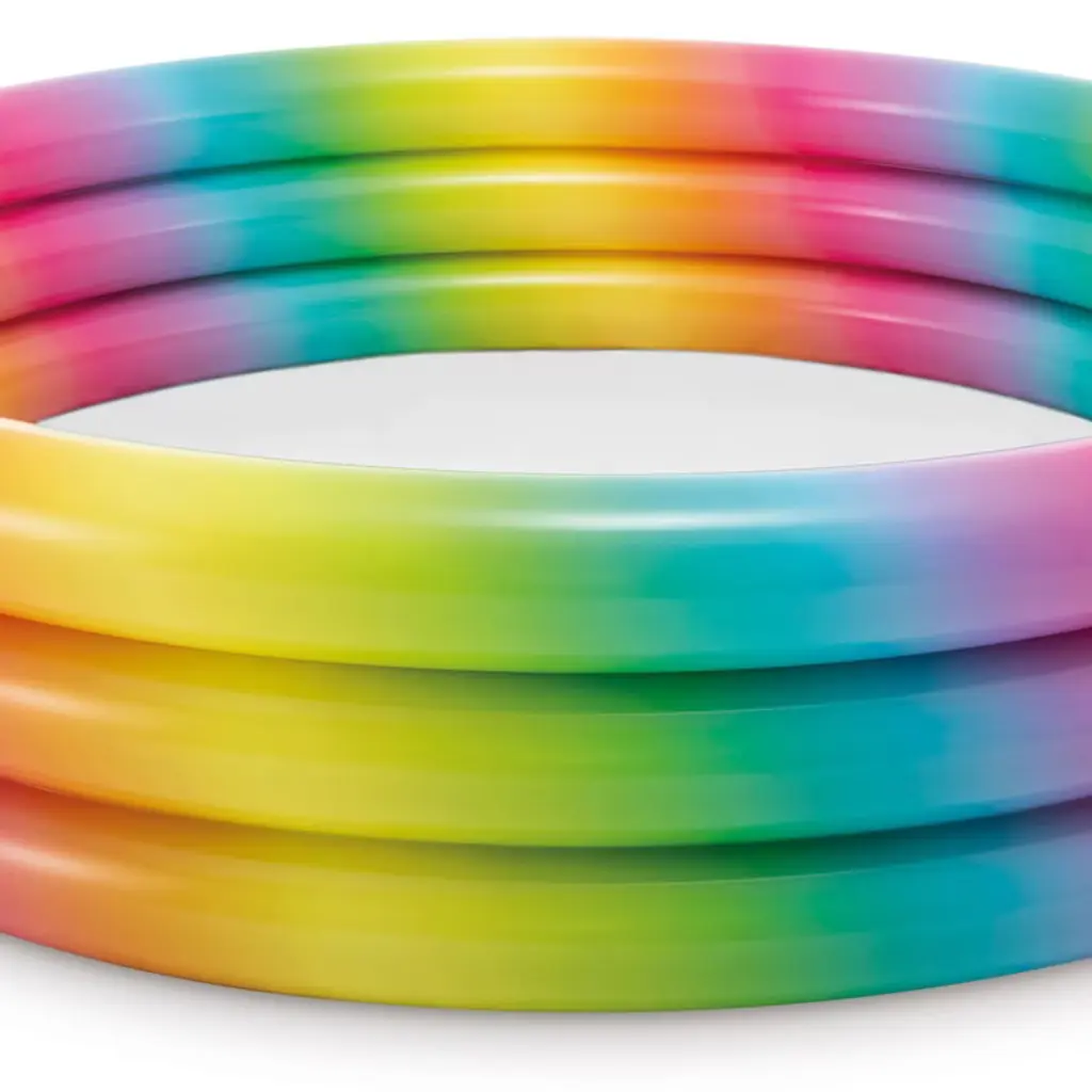 Stay cool and splash away with the Intex Rainbow Ombre Pattern 3 Ring Inflatable Kids Swimming Pool. This air-filled pool will be a great escape for the kiddos, especially on a scorching summer day. This kiddie pool is easy to set up and sits nicely on any outside surface. Simply inflate the pool to the correct size and your little ones can jump in. The pool can maintain up to 154 gallons of water and provides ample inside. In case of a leak, use the included repair patch for a quick fix. Measuring only 66 inches wide and 15 inches tall, the mini pool doesn't take up much room at all so the kids have plenty of space to run around. Recommended for kids ages 2 years old and up, the portable pool features a rainbow design that will bring a smile to every child. Once your little tykes are done swimming, simply deflate the pool for a hassle-free clean and storage experience. Bring water-filled joy to your kids with the Intex Rainbow Ombre Inflatable Swimming Pool.
