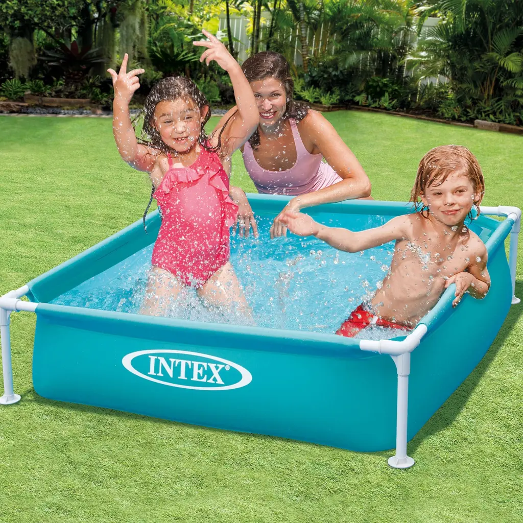 Your little swimmers will have a spectrum of colorful fun with this Intex 9.75ft x 6.33ft x 53in Inflatable Rainbow Play Pool and Ocean Play Pool. This swimming pool is filled with fun. It has a slide, ring toss game, ball roller game, ball toss game, water sprayer, and comes with 6 colored balls. This play center is for swimmers ages 2 and up and keeps children playing for hours on end. The wading pool allows for 4.5 inches of water and the main pool allows for 9 inches of water. The slide is super fun and has a comfortable landing pad at the bottom. It's made of heavy-duty vinyl with a vinyl liner and provides an ocean scene for your kids season after season. Your little ones can swim in paradise and experience the ocean-atmosphere in your backyard with the Intex 9.75ft x 6.33ft x 53in Inflatable Rainbow Play Pool and Ocean Play Pool. Intex Inflatable Rainbow Ring Water Play Center Your kids will have hours of fun in the Intex Rainbow Ring Water Play Center Includes a water slide, ring toss game, ball roller game, and ball toss game Built-in sprayer plugs into standard garden hose Wading pool allows for 10 inches of water with the main pool allowing for 6 inches Drain plugs in main pool and wading pool Repair patch included Ages: 2+ Material: Vinyl with vinyl liner Dimensions: 117 x 76 x 53 inches 9 feet 9 inches x 6 feet 4 inches x 4 feet 5 inches Weight:15.6 pounds Part number: 57453EP Intex Inflatable Ocean Play Center Kids Pool Wading pool allows for 4.5 inches of water and the main pool allowing 9 inches of water Pool water height is ideal for younger children Water sprayer attaches to garden hose to keep kids cool in summer Ocean Play Center Includes: Water slide Inflatable palm tree Turtle Whale toy Ring toss game Built-in sprayer Control valve to adjust water flow Drain plugs in both pools Heat-sealed seams are durable Repair patch kit included Material: Vinyl Warranty: 30 days Dimensions: 100 x 77 x 31 inches Weight: 14.8 pounds Part number: 57454EP