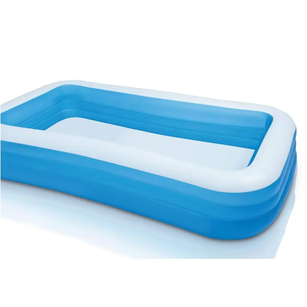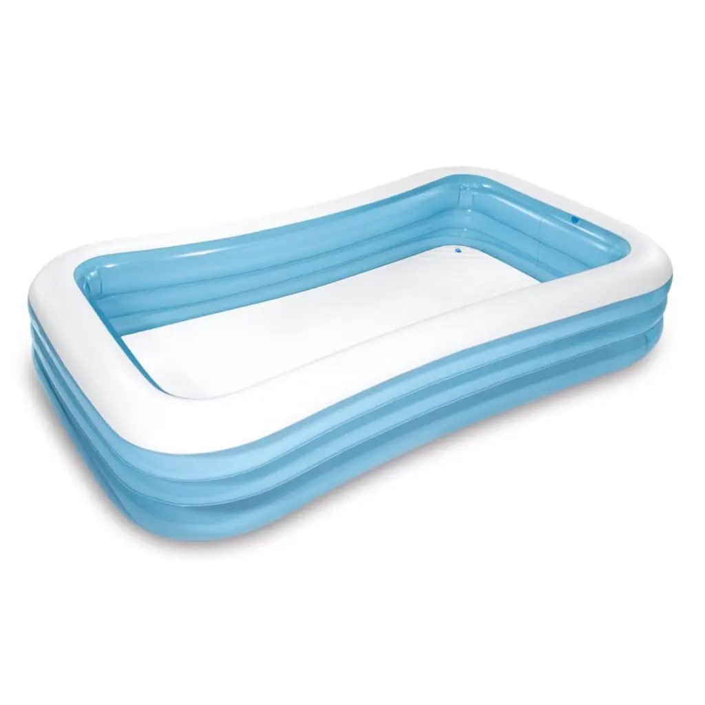 Have a splash with the whole family or friends in the Intex Swim Center family pool. The wide side walls allow for maximum play room, and 3 air chambers, each with a combo valve, make inflation and deflation a breeze. Build with a heavy gauge vinyl and 3 air chambers, this pool is ready for hours of fun in the sun! When inflated, this pool is about 120 x 72 x 22 inches and a water capacity of 264 gallons (14.5 feet of wall height). It's recommended for users ages 6 years and older. Have fun in your own backyard with the whole family all summer long with the Intex Swim Center family pool.