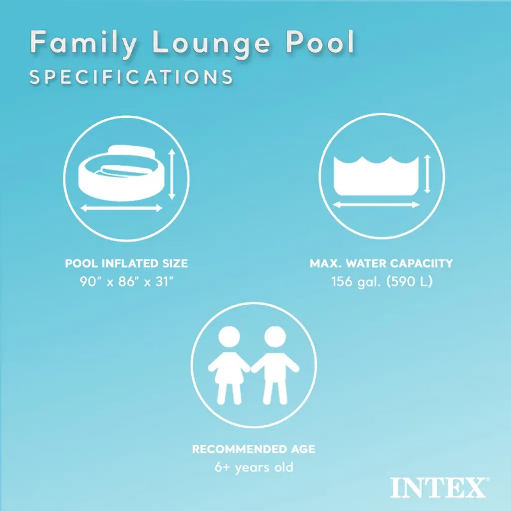 Transform your backyard into a vibrant oasis of leisure and entertainment with the Intex Swim Center Family Lounge Pool. This outdoor pool is designed to provide endless fun and relaxation for your family. Its user-friendly setup guarantees a swift inflation process, enabling your little ones to splash and play in no time. The pool's enchanting ocean graphics bring the beach experience right to your doorstep, infusing your space with color and style. Featuring a simple setup, this outdoor pool offers quick inflation and is ready to fill with water to have your little one playing in minutes. With a built-in bench, you'll be able to get comfy and relax while watching your toddler swim for hours upon end. Equipped with 2 air chambers, the deflation process is just as quick, making this pool easy to store for enjoyment next season. The Easy Set round pool cover helps keep your pool free of dirt, insects, and debris while it's not in use. Made of high-quality 7-gauge PVC vinyl materials, this durable cover will protect your pool and feature drain holes to avoid water from accumulating on the top. With a 12-inch overhang, you can ensure a secure fit that floats above the water and stays on during all weather conditions. Your kids will never want to leave your backyard with the Inflatable Outdoor Swimming Lounge Pool and Cover from Intex.