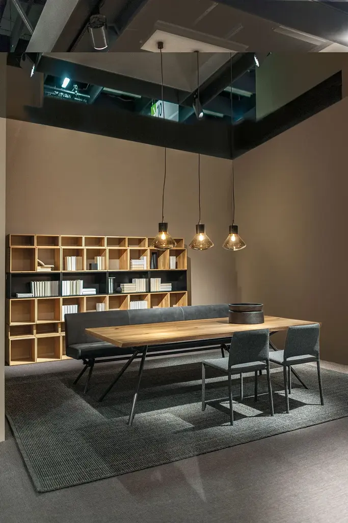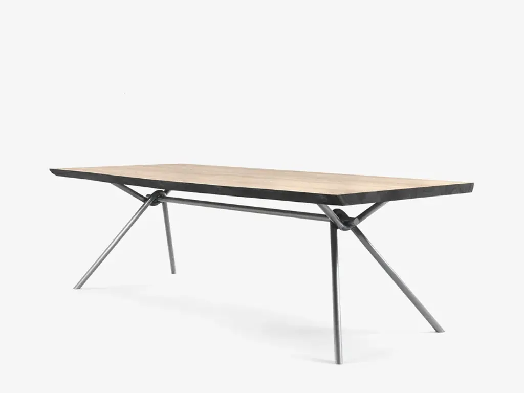 IRON LIGHT NATURAL SIDES is a table with a solid wood top made of glued planks with natural edges.The base is minimal and linear, made from woven hollow iron tubing.Upon request, it is also available in woven solid iron tubing.