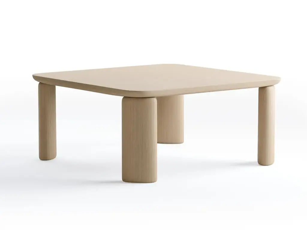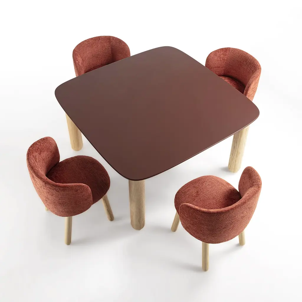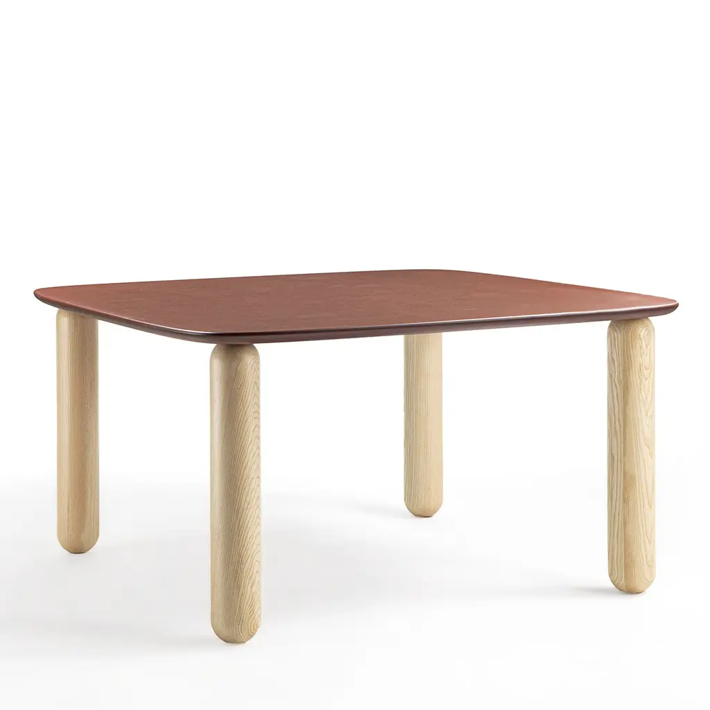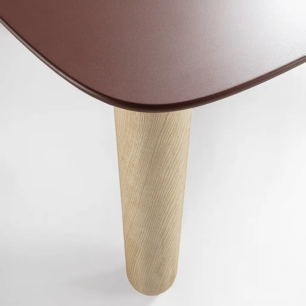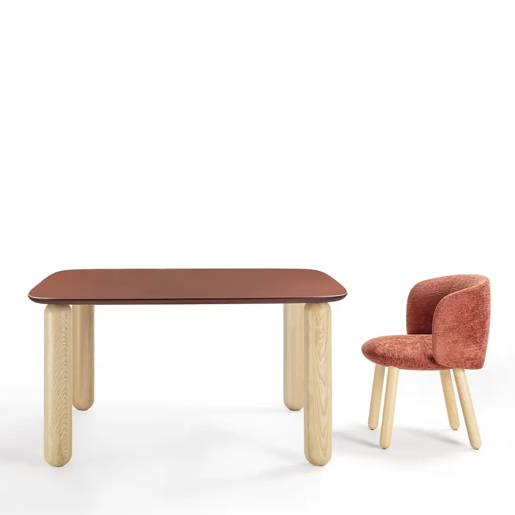 This table features a classic four-leg turned wood base, available in elegant ash. Its top is crafted from scratch-resistant lacquered wood, ensuring durability and a sleek finish. This design seamlessly blends traditional craftsmanship with modern functionality, making it a perfect centerpiece for any contemporary space.