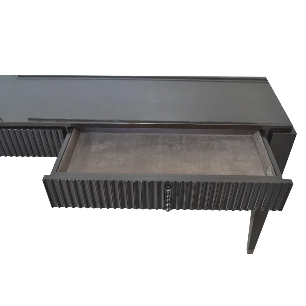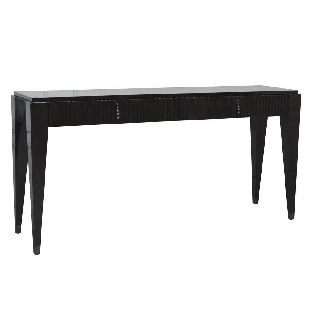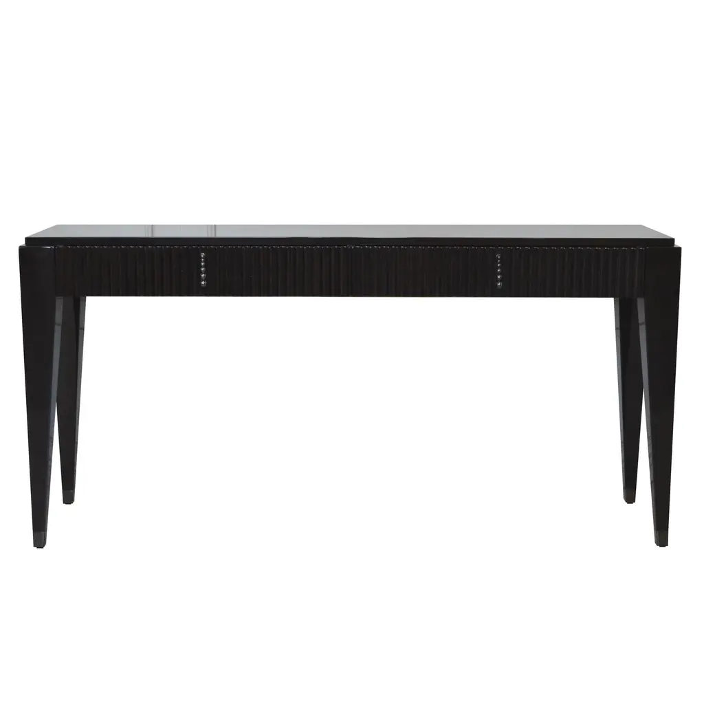 Elegant Italian dark brown mahogany veneer console/writing desk from the style of Art Deco period supported on four legs with a high-gloss polish finish. In the style of CAVIO, with two drawers, that are upholstered inside. Its dimensions and proportions are a good testimony of this style where modernity and old world craftsmanship came together in an unprecedented way.