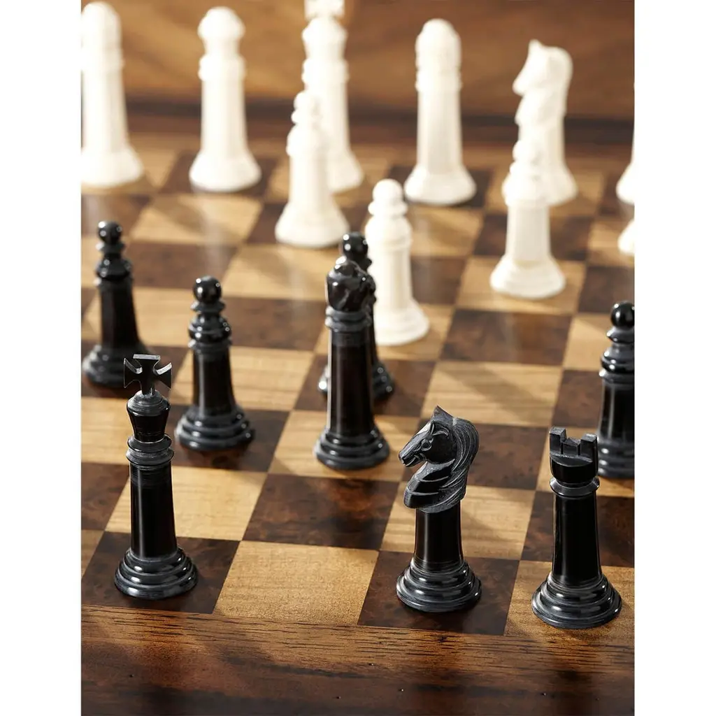 Italian style rustic round game table with molded edge, made of mahogany, acacia and oak parquetry with reversible leather and chess inlaid center, an inlaid Backgammon board well, on an octagonal flared column pedestal base. Includes a wooden chess set and Backgammon counters.Dimensions: 42" W x 42" D x 30" H.