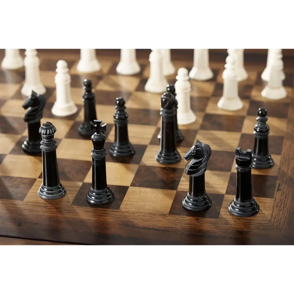Italian style rustic round game table with molded edge, made of mahogany, acacia and oak parquetry with reversible leather and chess inlaid center, an inlaid Backgammon board well, on an octagonal flared column pedestal base. Includes a wooden chess set and Backgammon counters. Dimensions: 42" W x 42" D x 30" H