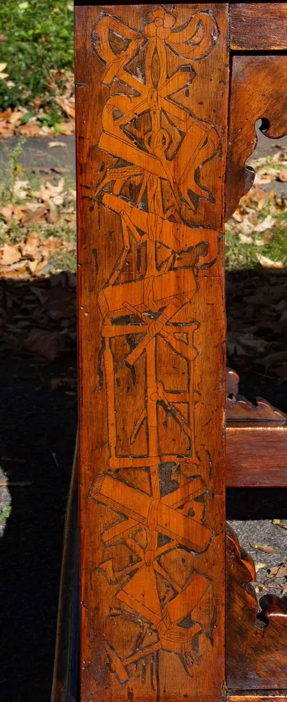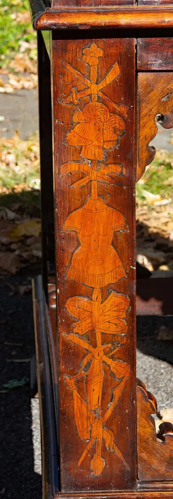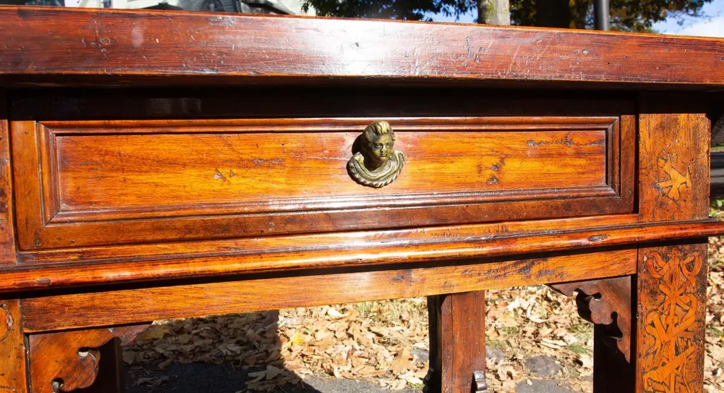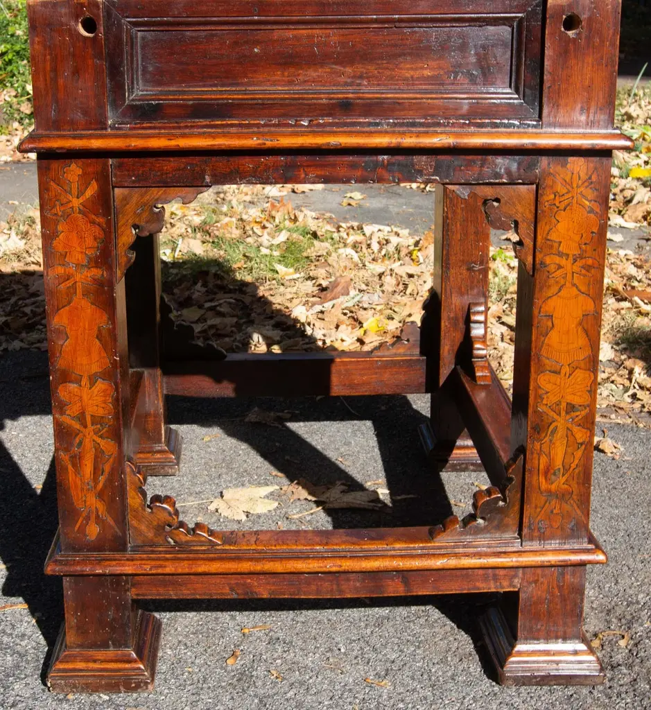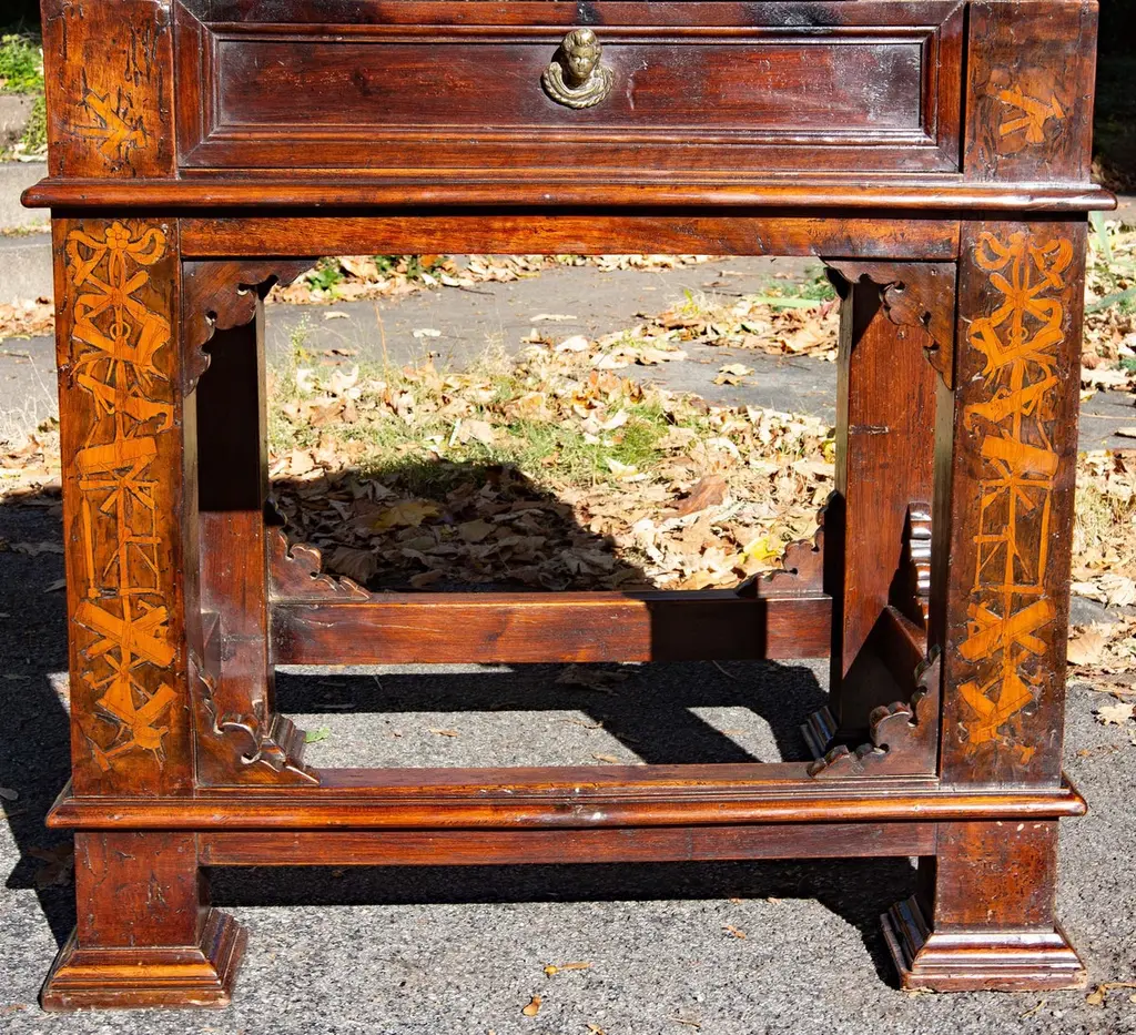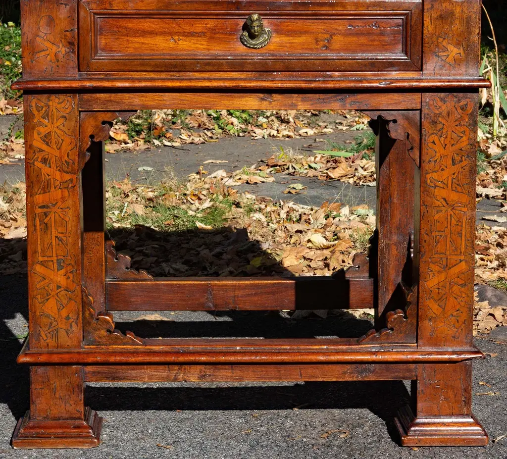 A substantial rustic Italian baroque one drawer table with marquetry. Solid walnut with very unusual marquetry. The table is decorated on all four sides and may be used as a center or library table. The inlay shows all the many tools of a furniture maker and also military weapons, guns, swords armor. The top is 2" thick solid walnut. The table is quite solid. Please, contact Joseph Dasta Antiques for shipping options. # renaissance Italy Tuscany antique stand provincial spanish spain 18th 15th not signed framed provenace new york paris bronze silver gold leaf carved