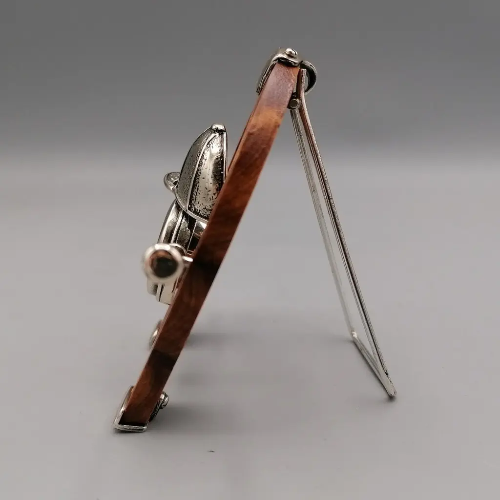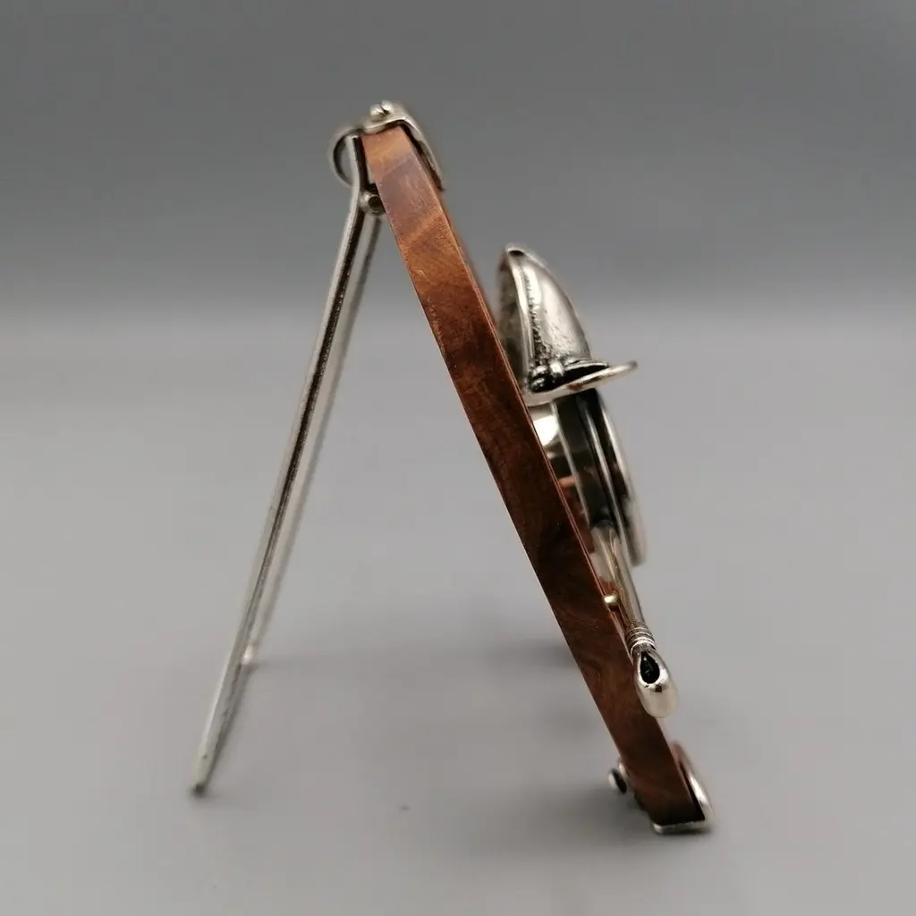 Italian Table Clock In 800 Silver And Wood Depicting Polo Game Equipment